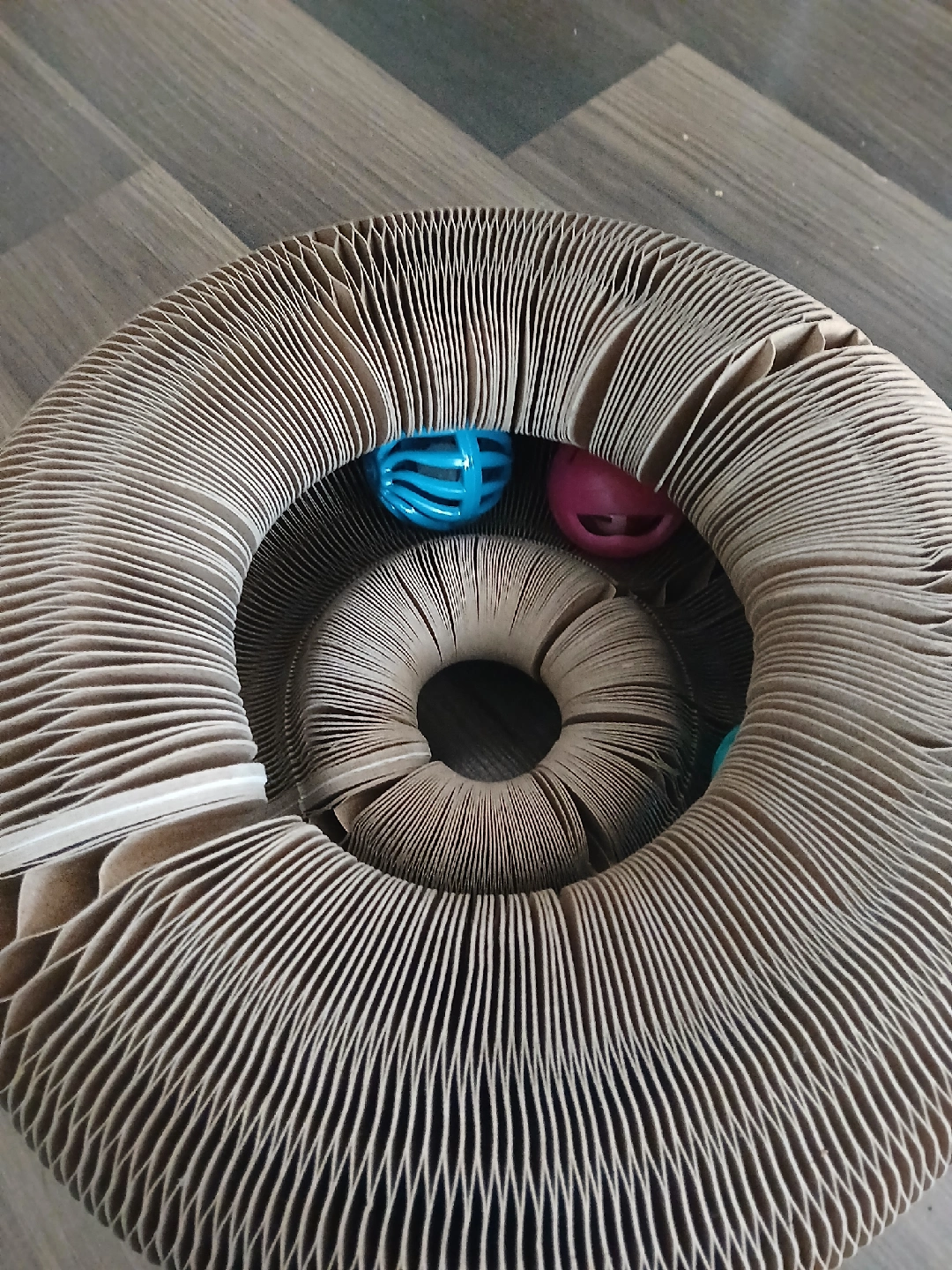 Selling a cat scratcher lounge bed! It's made of corrugated cardboard and has a fun ball toy in the middle. Your kitty will love scratching, playing, and lounging on this comfy bed. has extra balls added