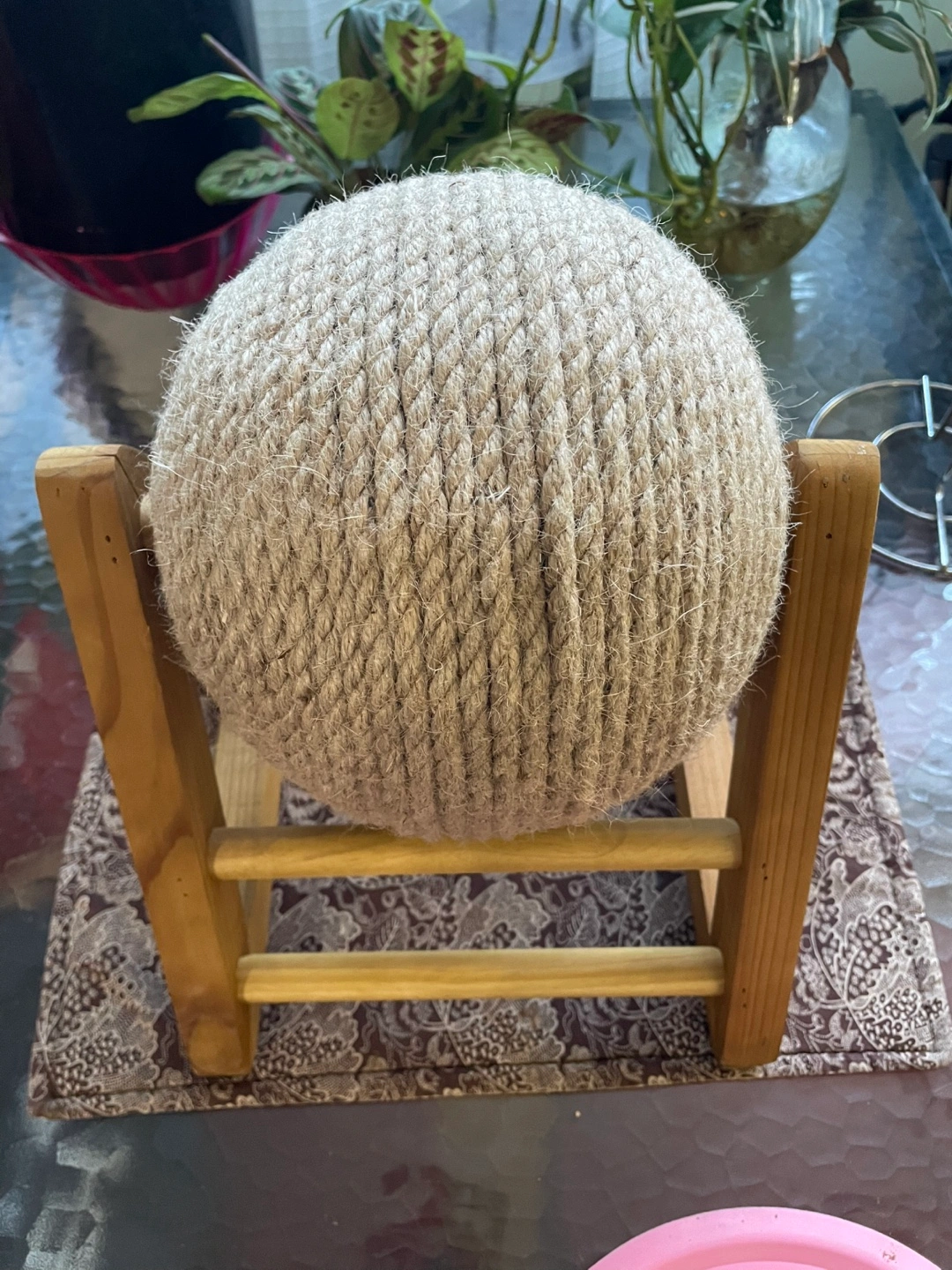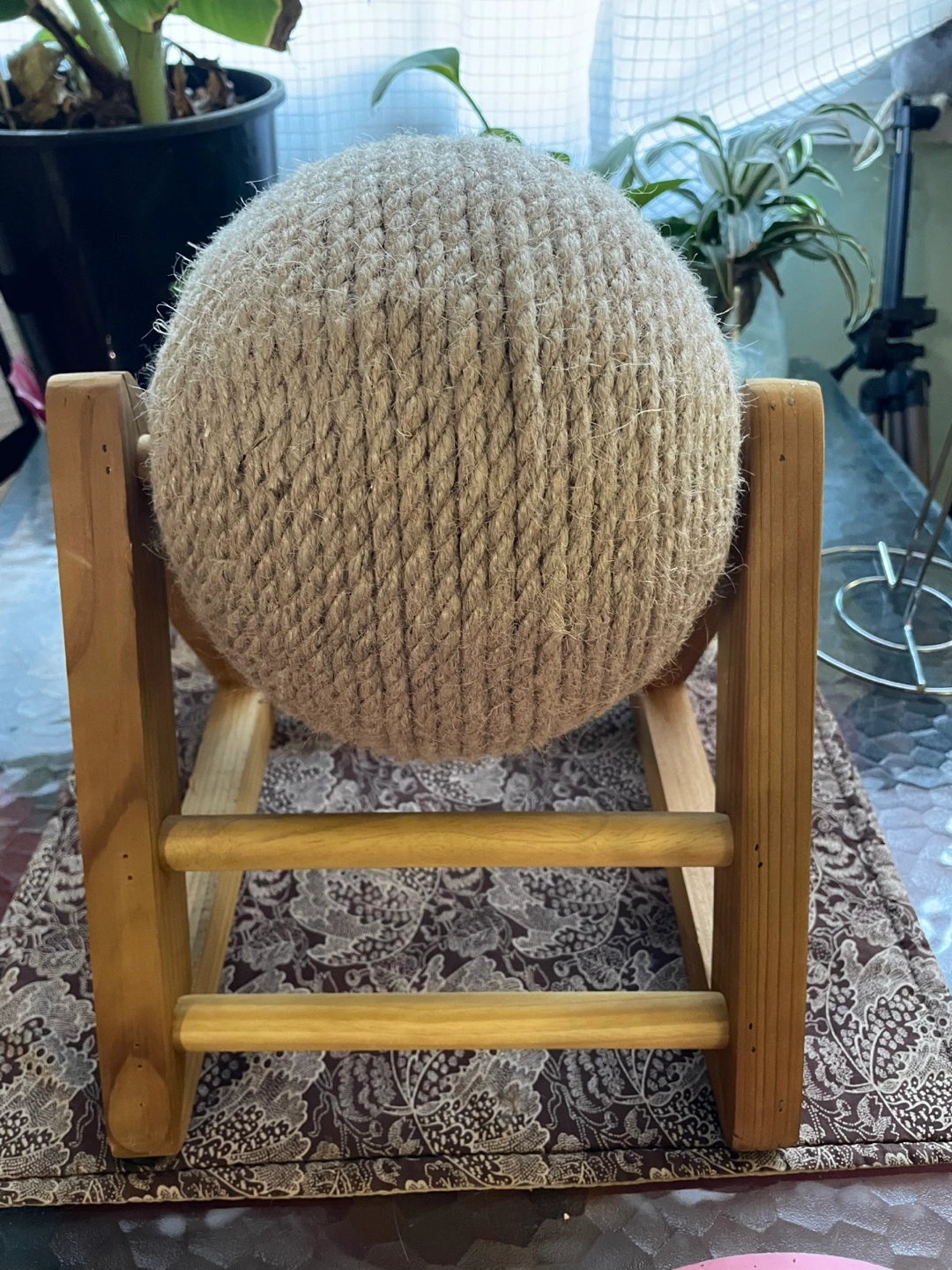 Wooden stand holds sisal rope ball. The scratcher is on a spinner so it moves while your cat scratches it! Perfect for cats to play and scratch. Gently used. My cat didn’t show any interest in this at all unfortunately! He never scratched it so the scratcher is in like new condition! Paid $45, selling for $30 :)