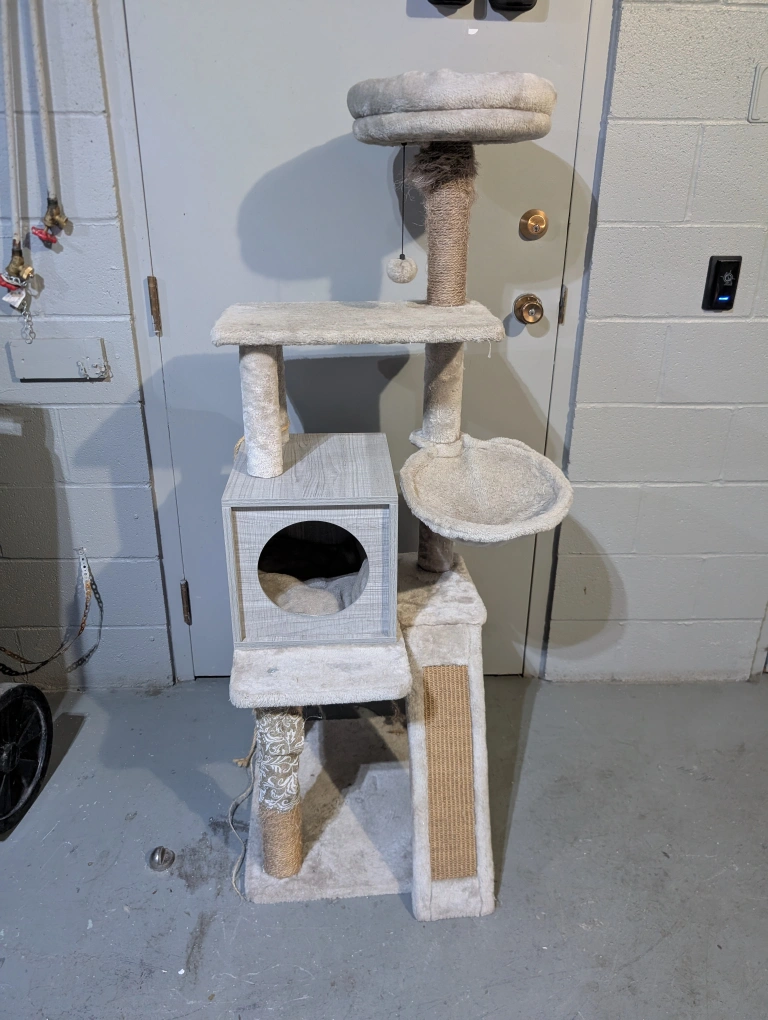 Selling a cat tree in good condition. It features multiple levels for your cat to explore and relax on. There's a little condo, scratching posts, and soft platforms for lounging. It's a great way to keep your cat entertained and off your furniture!