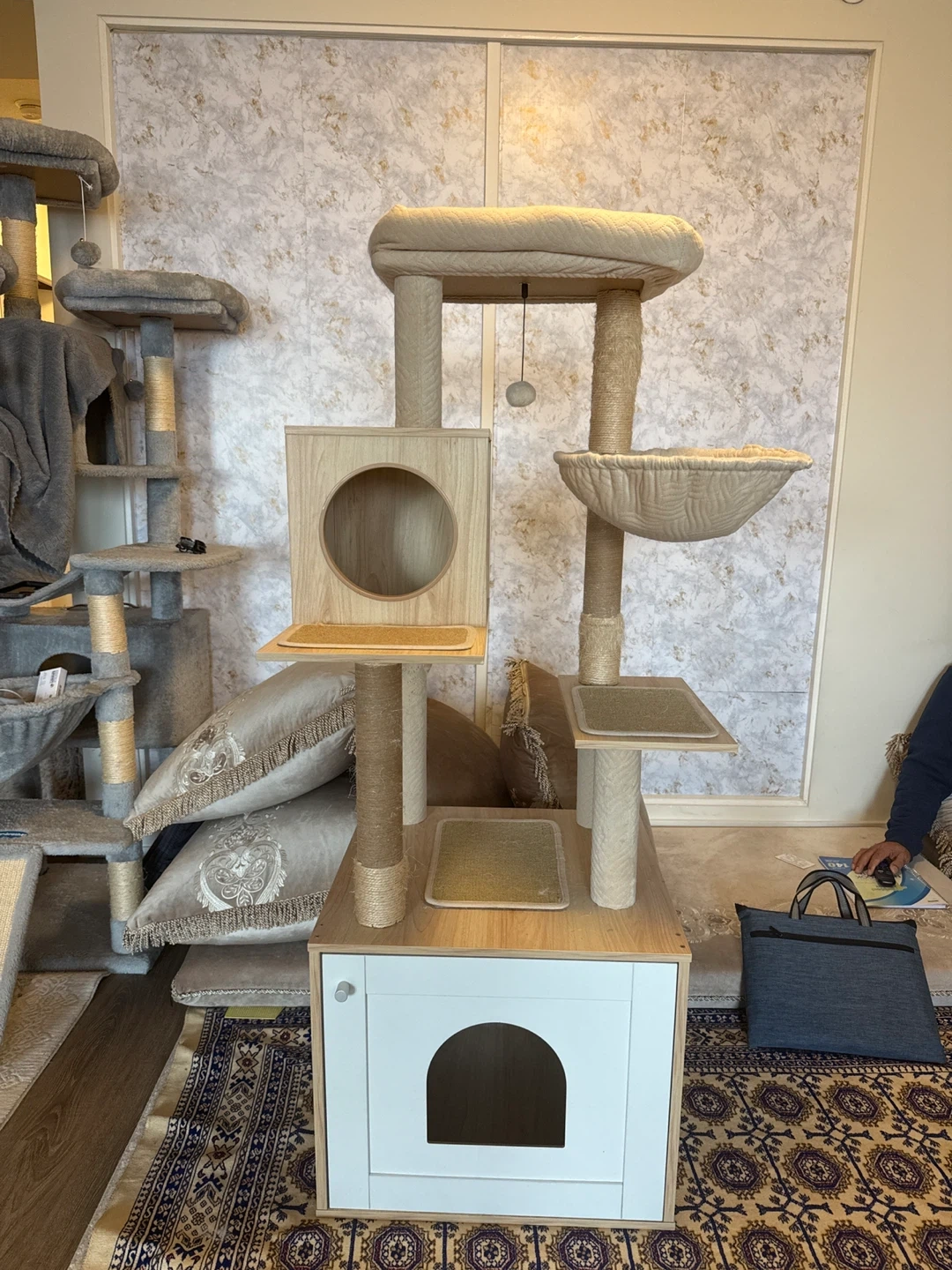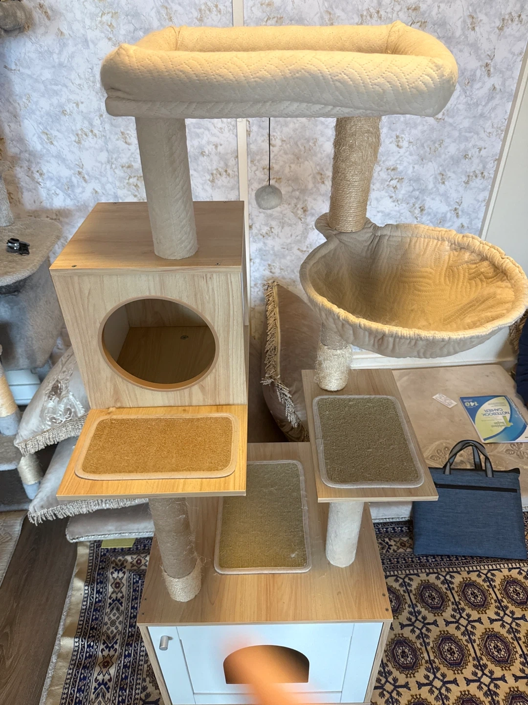 0Selling a cat tree condo with scratching posts. It's in good condition and ready for a new home. It features a cozy condo, multiple platforms, and scratching posts to keep your feline friend entertained and happy