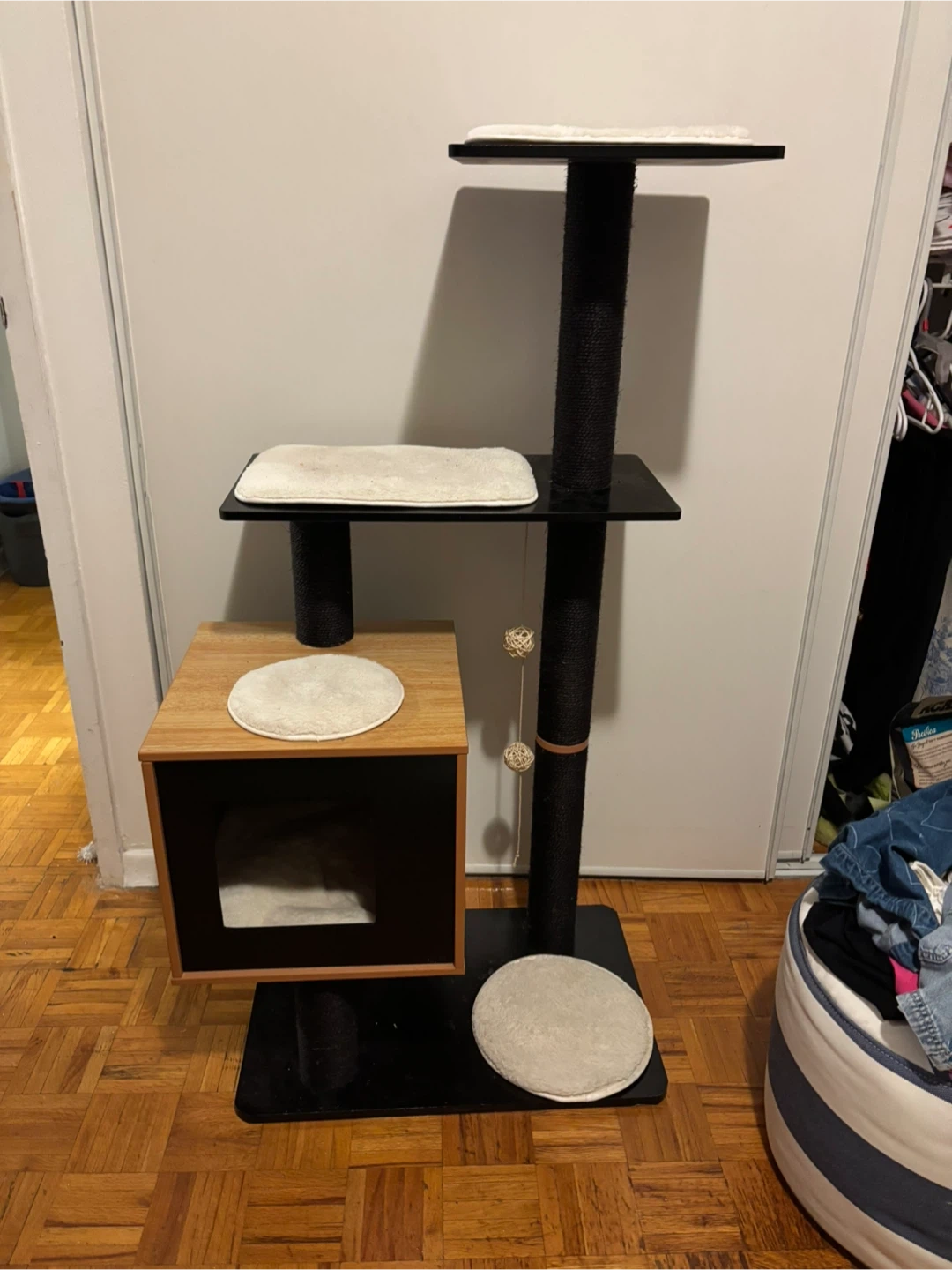 68Selling a cat tree with a scratching post and condo. It's in good condition and has multiple levels for your cat to explore and play on. The condo provides a cozy space for your furry friend to relax. Great for keeping your cat entertained and off your furniture! My cat has never cared about it so it should smell like her, she’s hairless anyway. All the pads are machine washable.