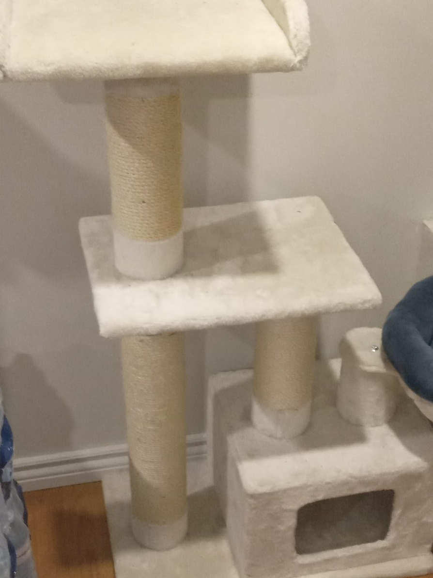 65Selling a gently used cat tree in great condition! It features multiple levels for your feline friend to explore and relax on. The scratching posts are wrapped in durable material, perfect for keeping your cat's claws healthy and your furniture safe. It also has a little hideaway at the bottom