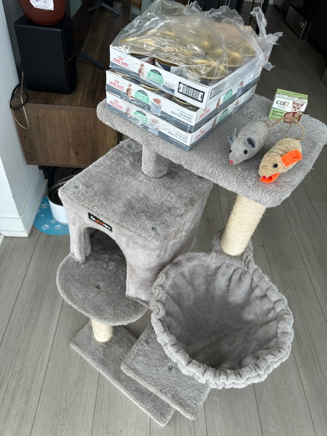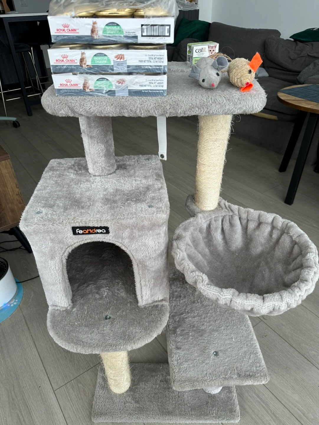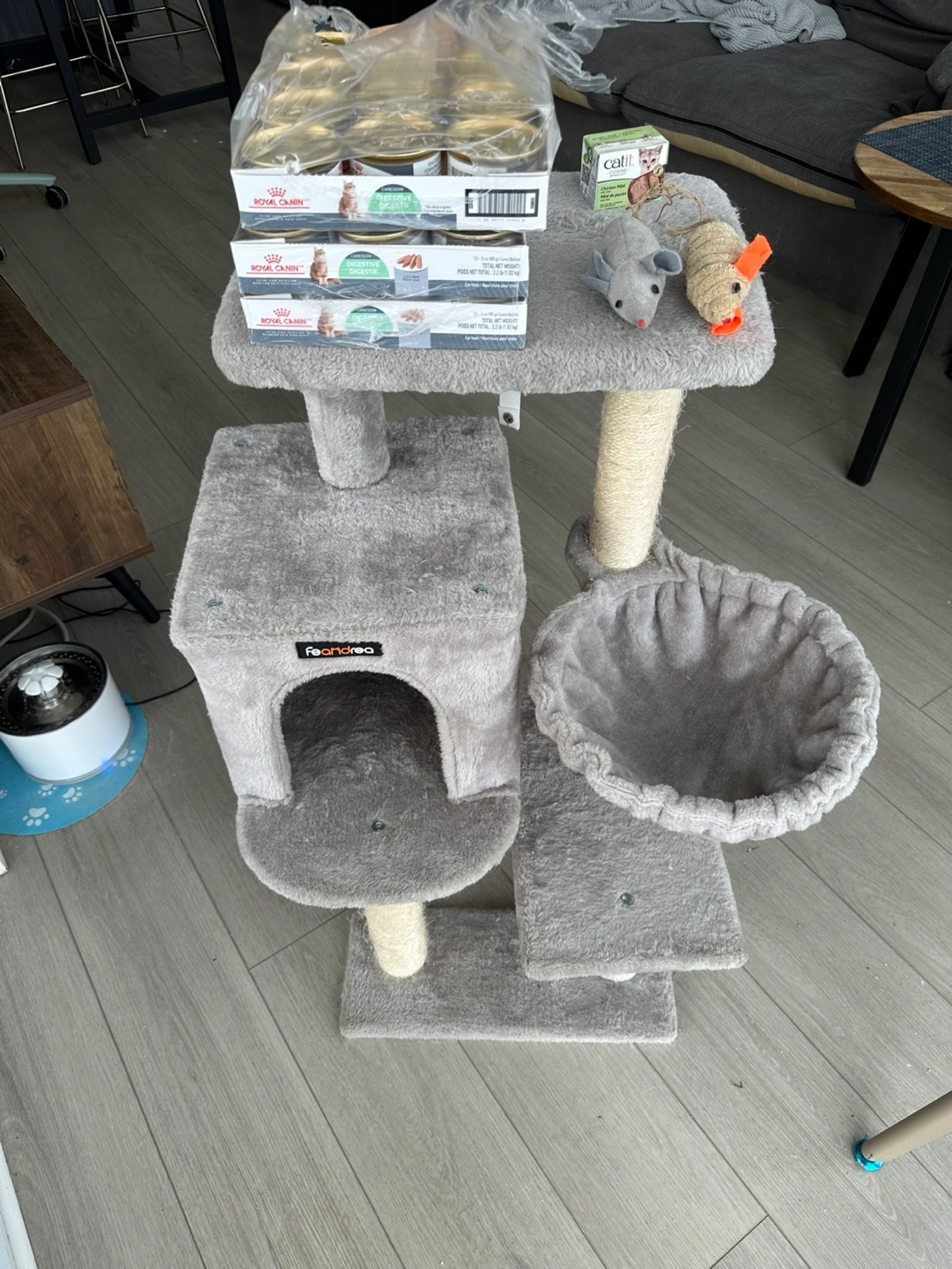 Grey cat tree, three levels. Includes two cat toys and three boxes of Royal Canin Digestive cat food. Brand: Feandrea.
