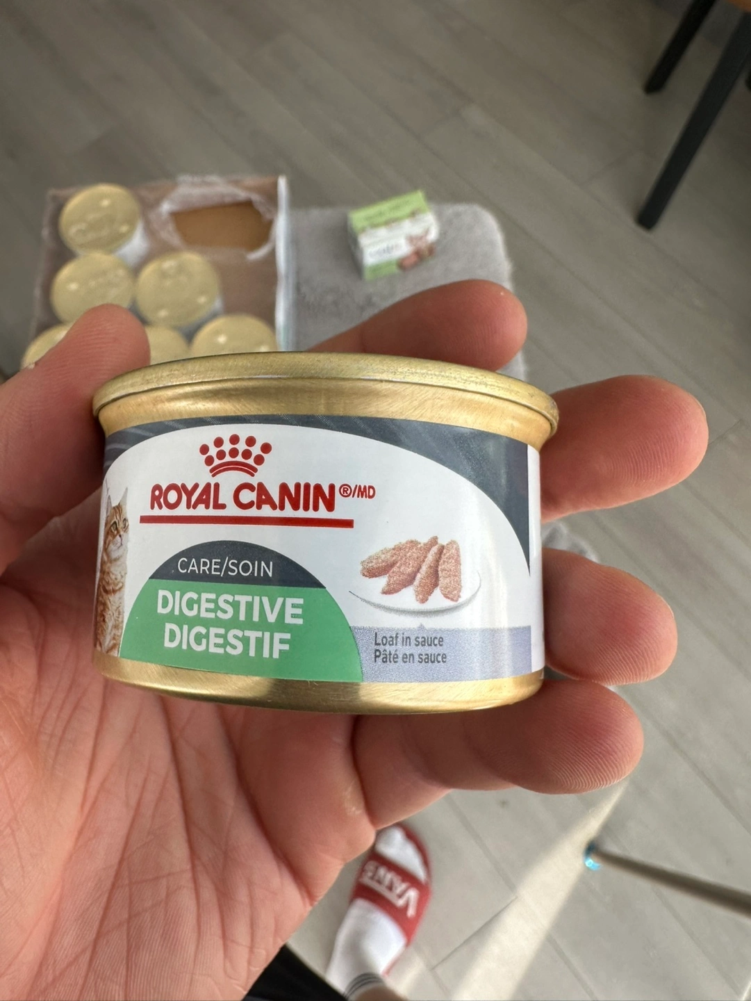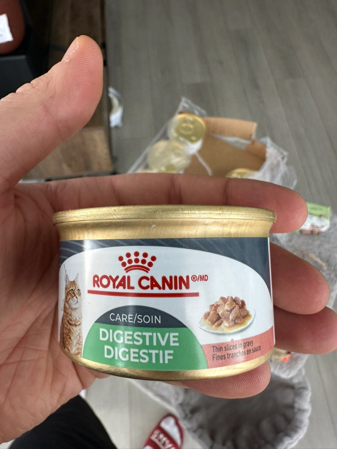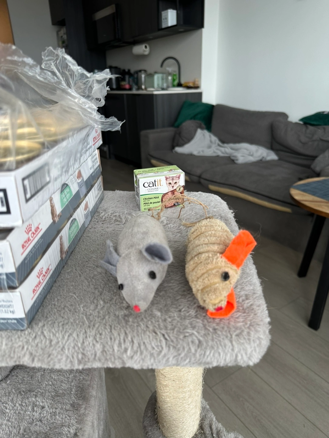 Grey cat tree, three levels. Includes two cat toys and three boxes of Royal Canin Digestive cat food. Brand: Feandrea.