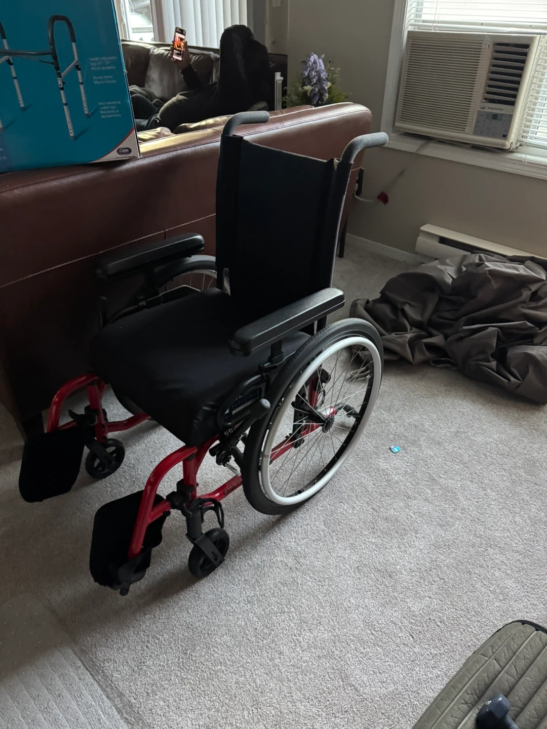 Selling a Catalyst 5 wheelchair with a vibrant red frame! It looks to be in good condition and ready for a new home. This lightweight wheelchair is designed for easy maneuverability and comfortable seating.