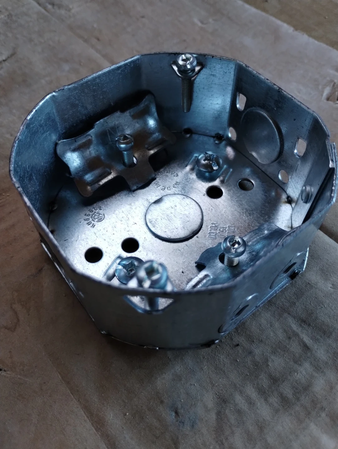 This is a galvanized steel octagonal electrical box. It's suitable for ceiling fan installation. Comes with pre-drilled knockouts for wire entry.
