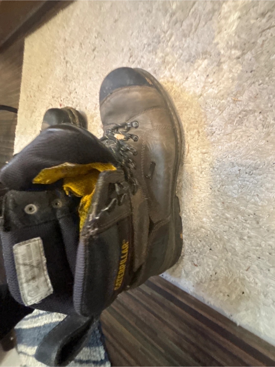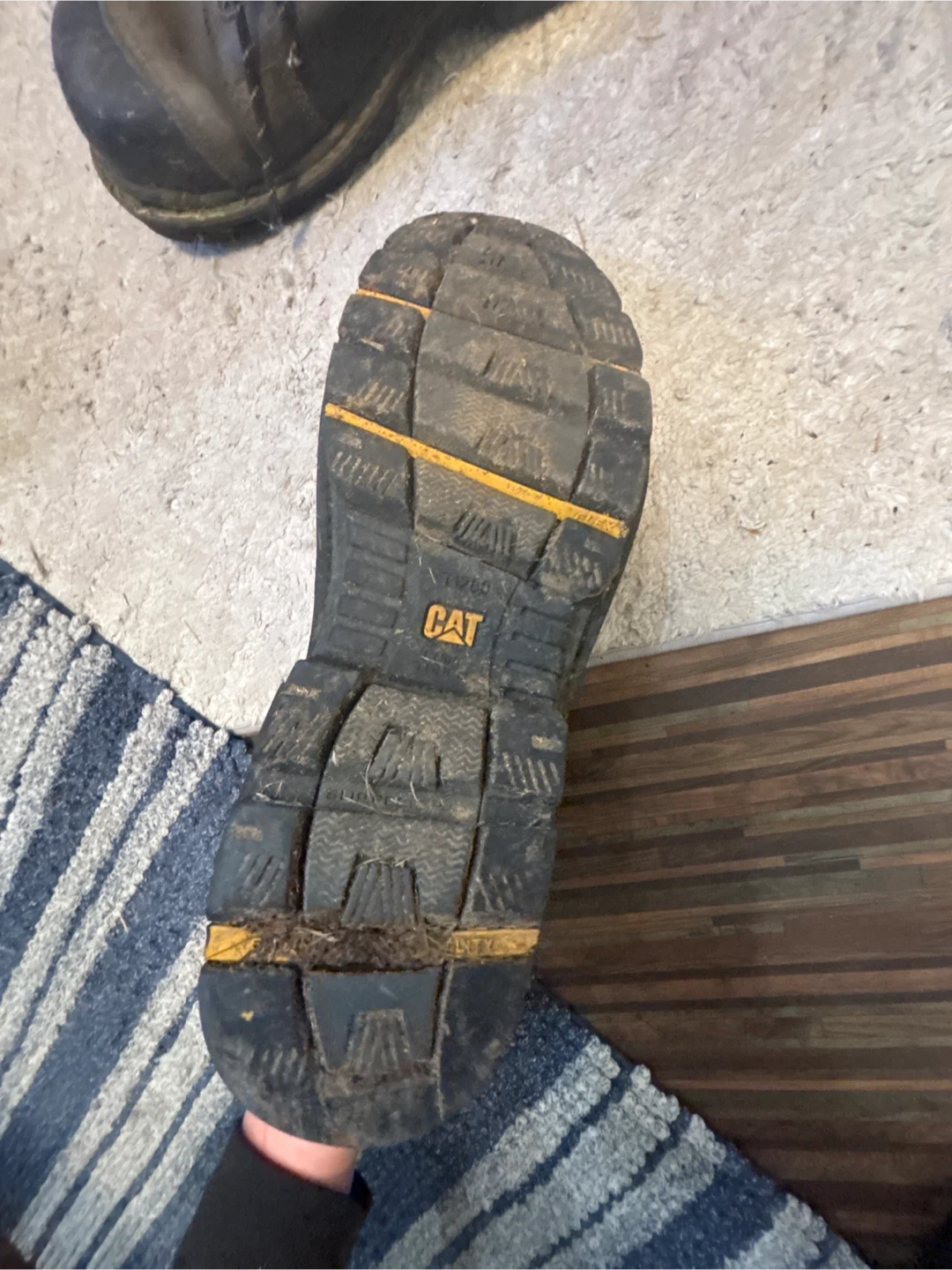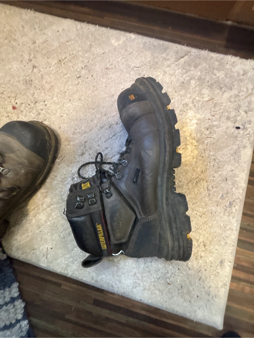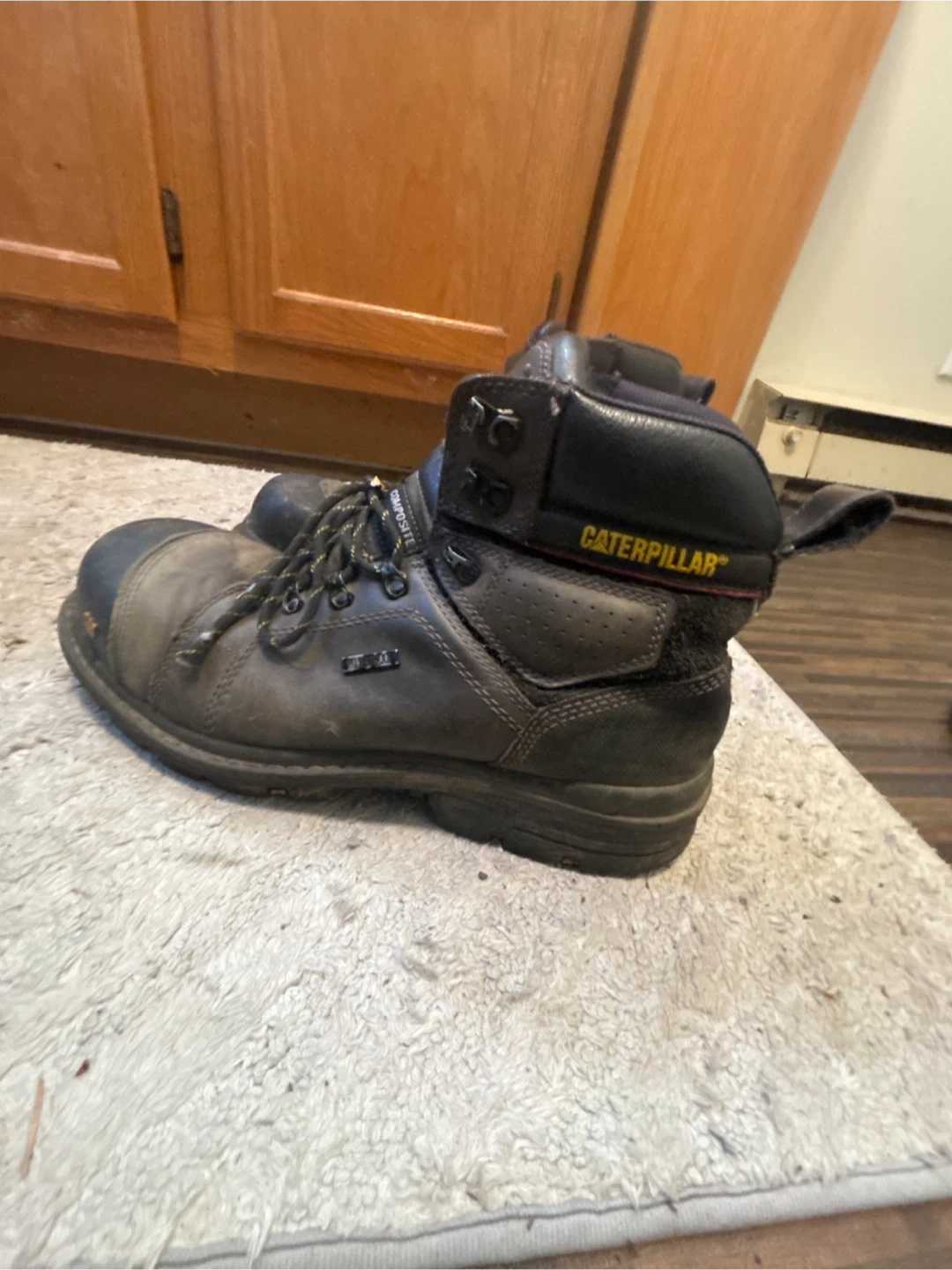 10Selling a pair of Caterpillar work boots. They look like they've been used but still have some life left in them. The size is 12marked, so please take a look at the photos to see if they'll fit you. Great for construction or any tough job! Will be cleaned if sold