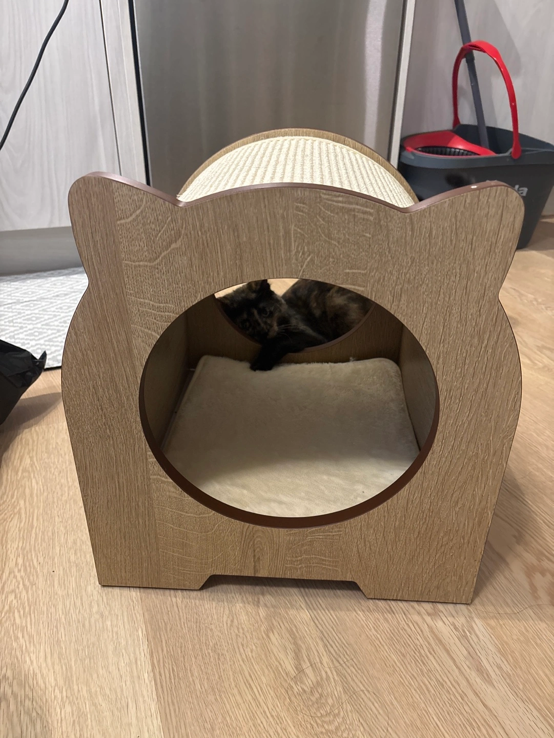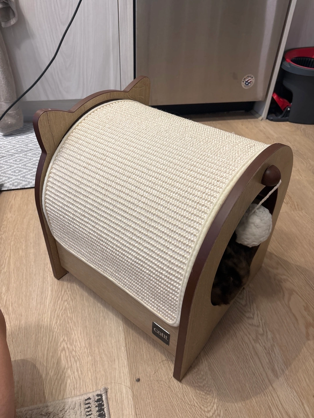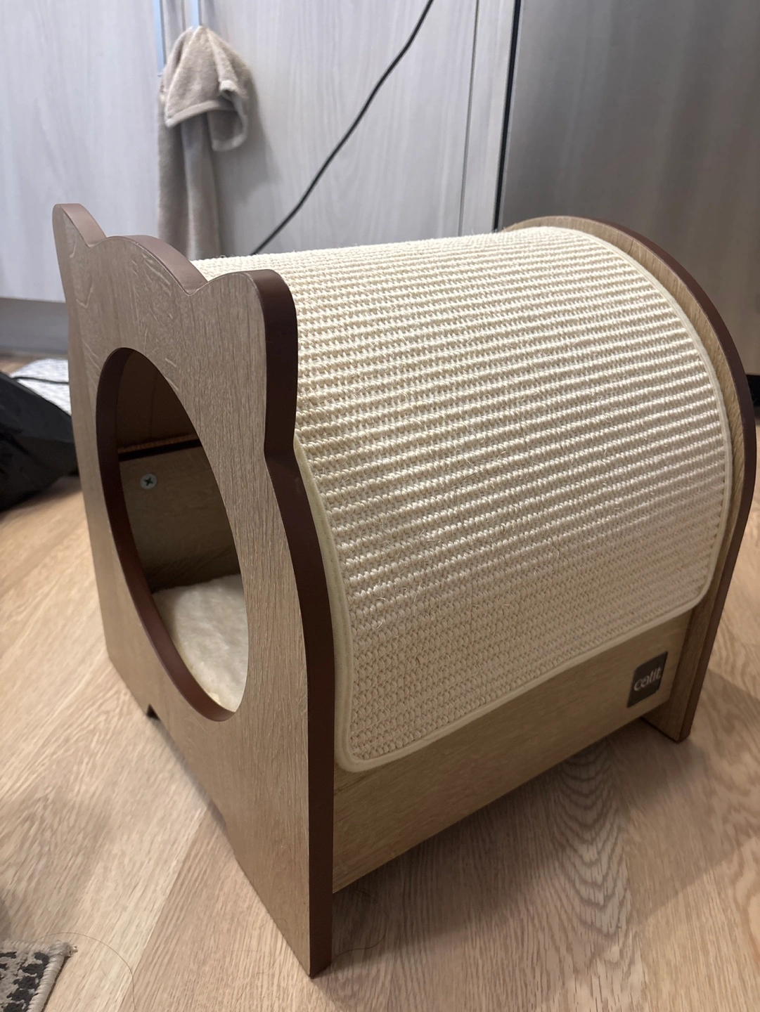 15Cute cat house with scratching surface. Features a soft bed inside. Wood and sisal construction. Good for small to medium-sized cats.