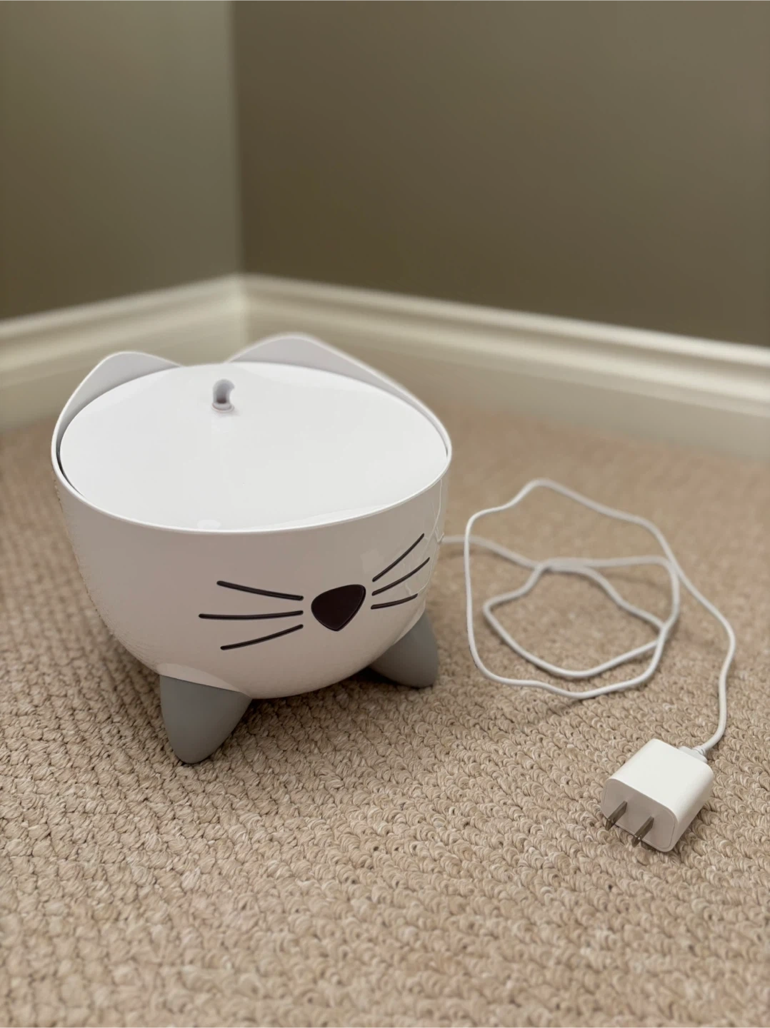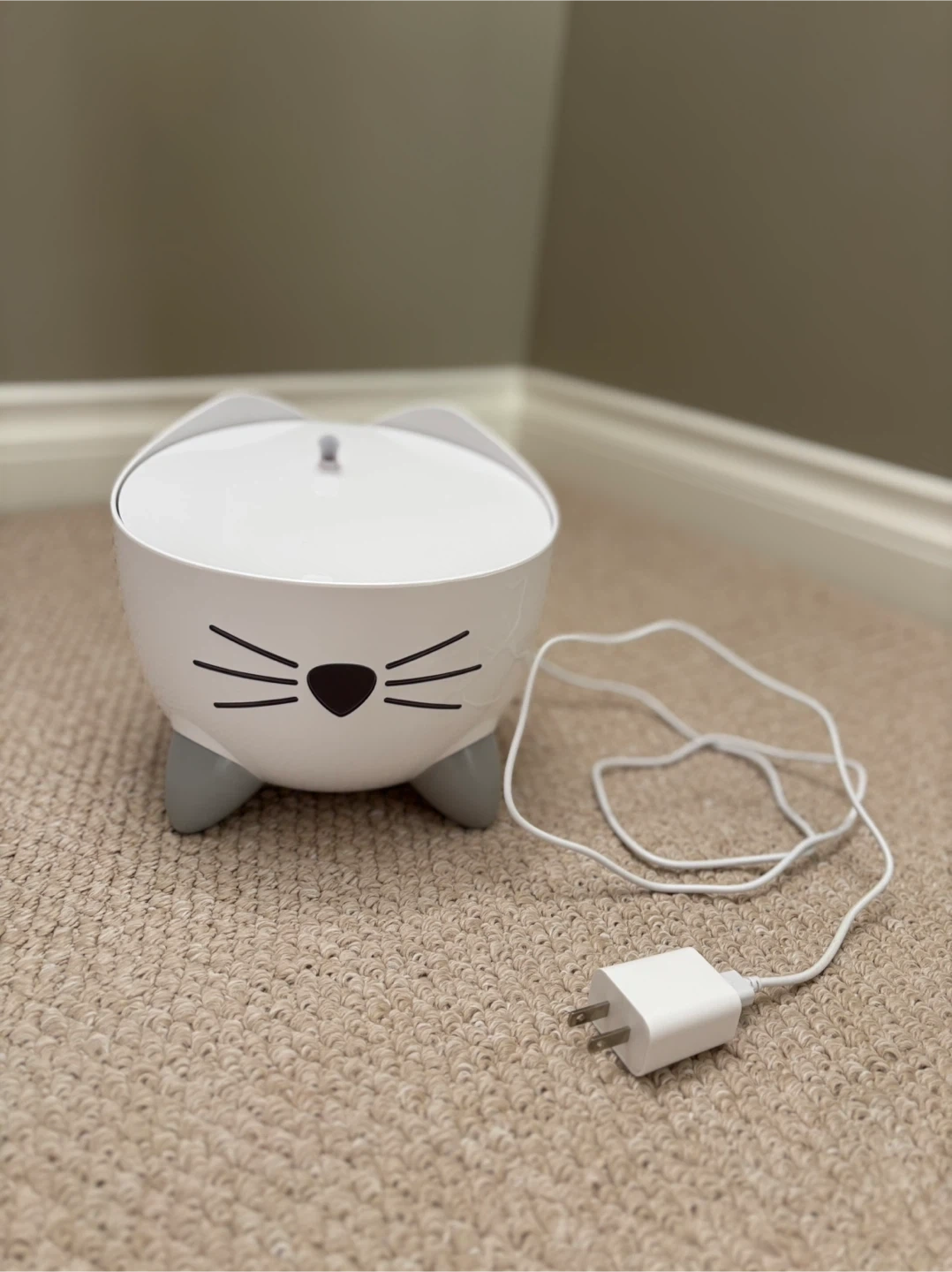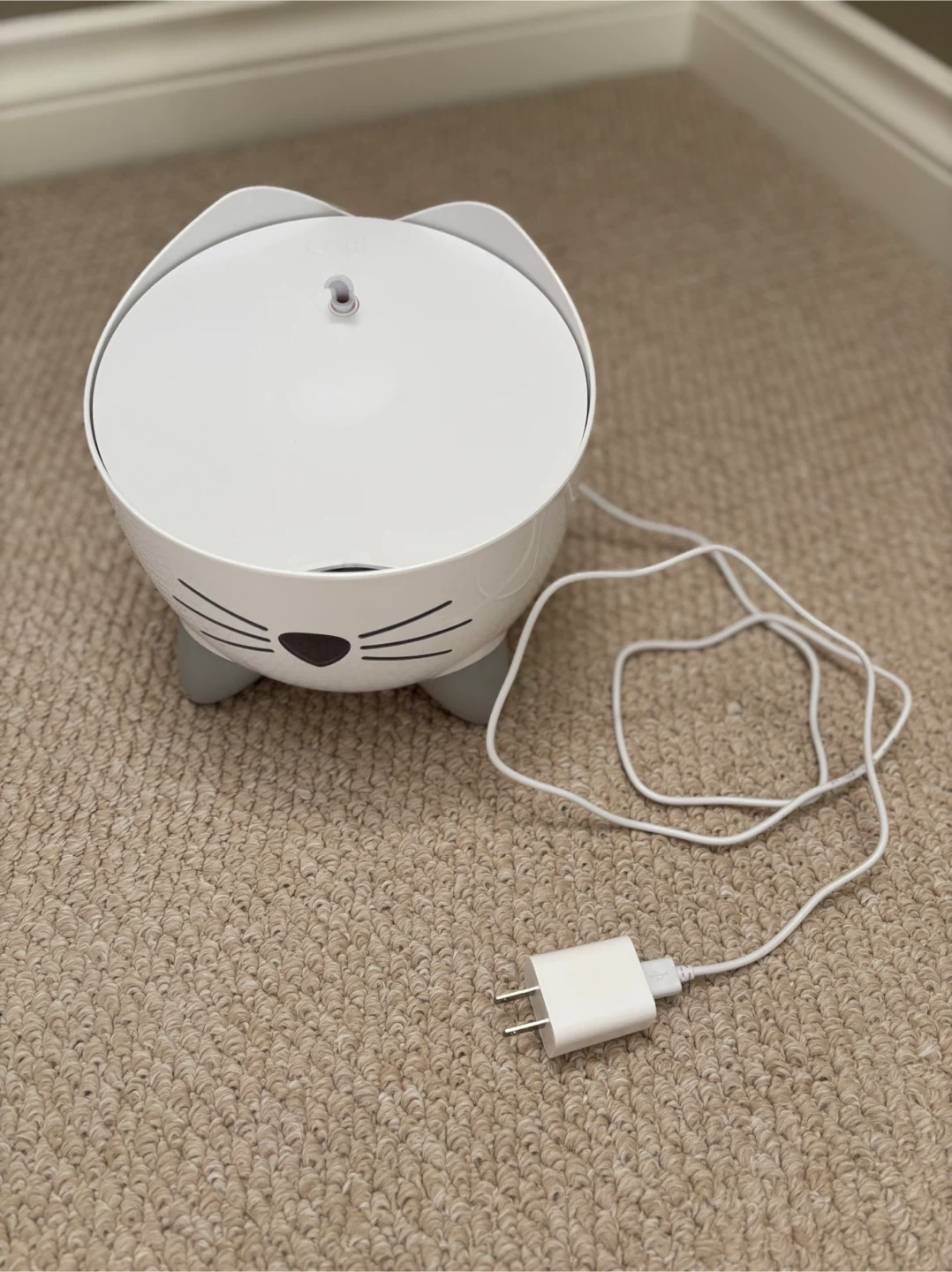 Selling a cute cat water fountain! It's in great condition and comes with ALL PIECES. It's a great way to encourage your kitty to stay hydrated. The design is adorable, with little cat ears and whiskers. It's easy to clean and keeps the water fresh - NEVER USED (BRAND NEW)