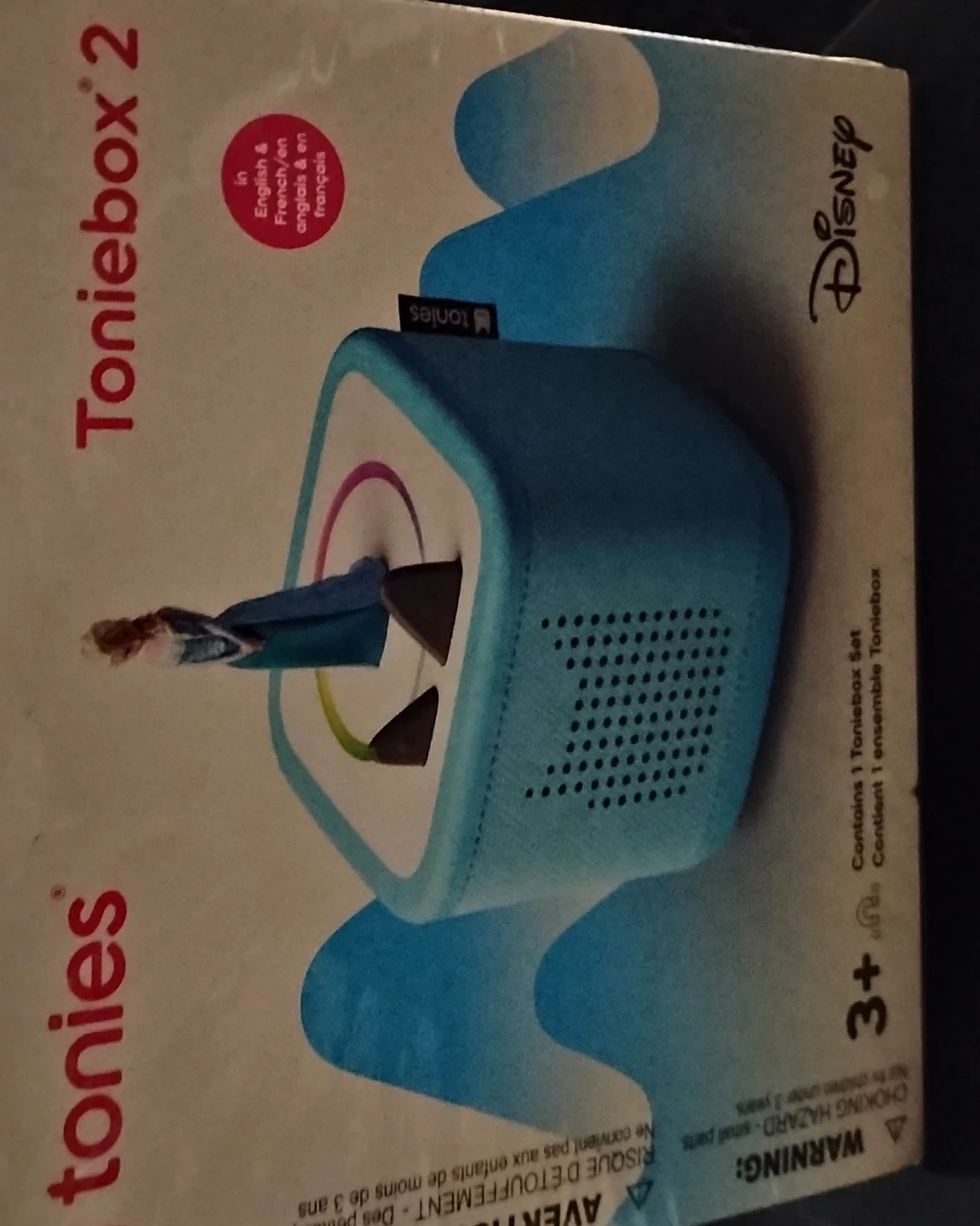 This is a Toniebox 2 audio player, perfect for kids. It contains one Toniebox set and plays content in English and French. Recommended for ages 3 and up.
