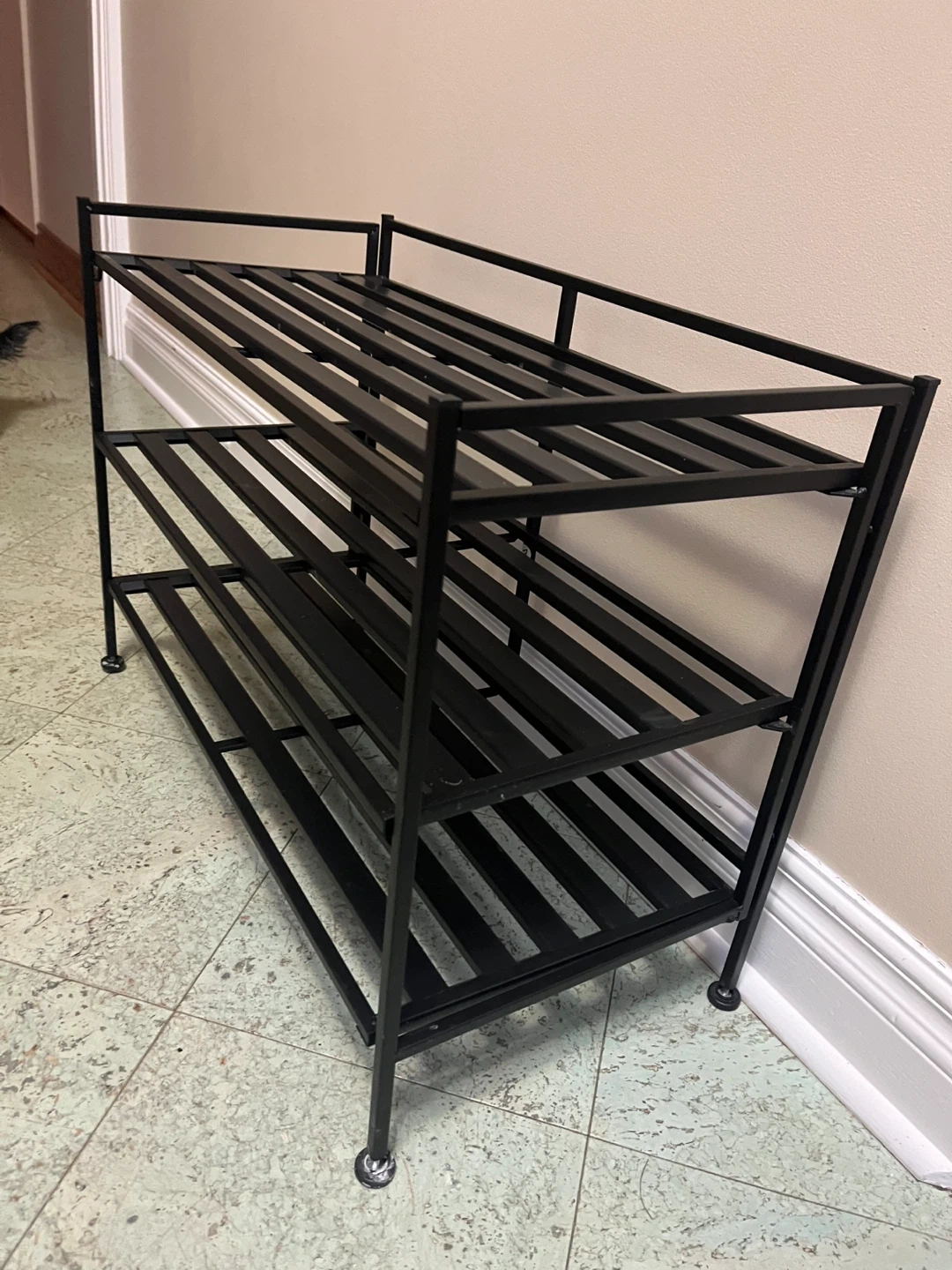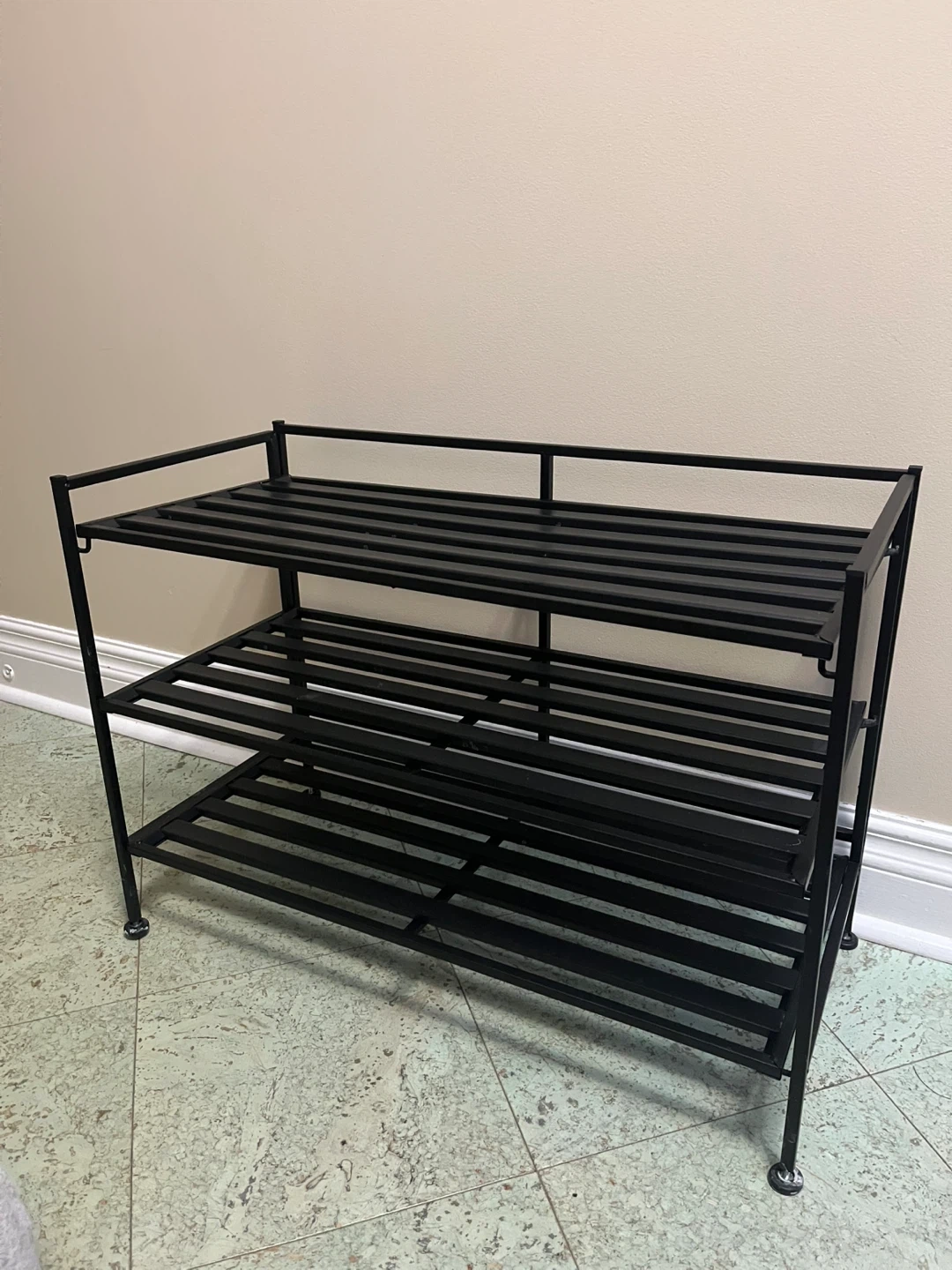 This is a three-tier shoe rack made of black metal. It's designed with slatted shelves for ventilation. It's great for organizing footwear by the door or in a closet.