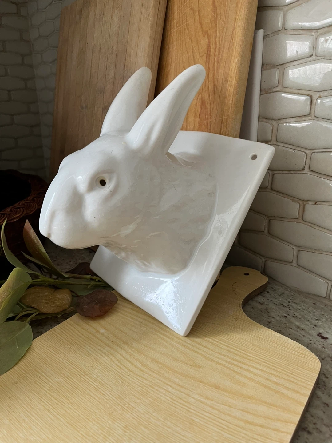 This item is a vintage white ceramic rabbit head wall hanging, often used as a hook for towels or aprons in farmhouse-style kitchens.