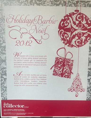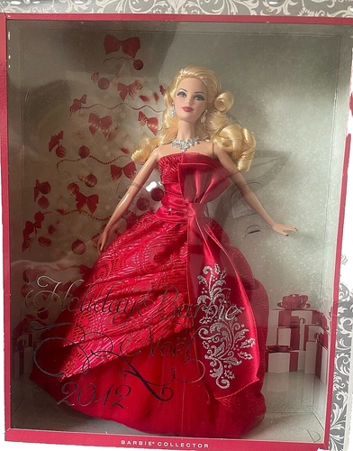 Celebrate the holidays in style with the Holiday Barbie 2012 Collector Doll by Mattel. This elegant 12-inch fashion doll features a stunning red satin gown with intricate silver embroidery, perfect for any special occasion. Her blonde wavy hair is styled with a matching red bow, and her piercing green eyes add a touch of glamour.