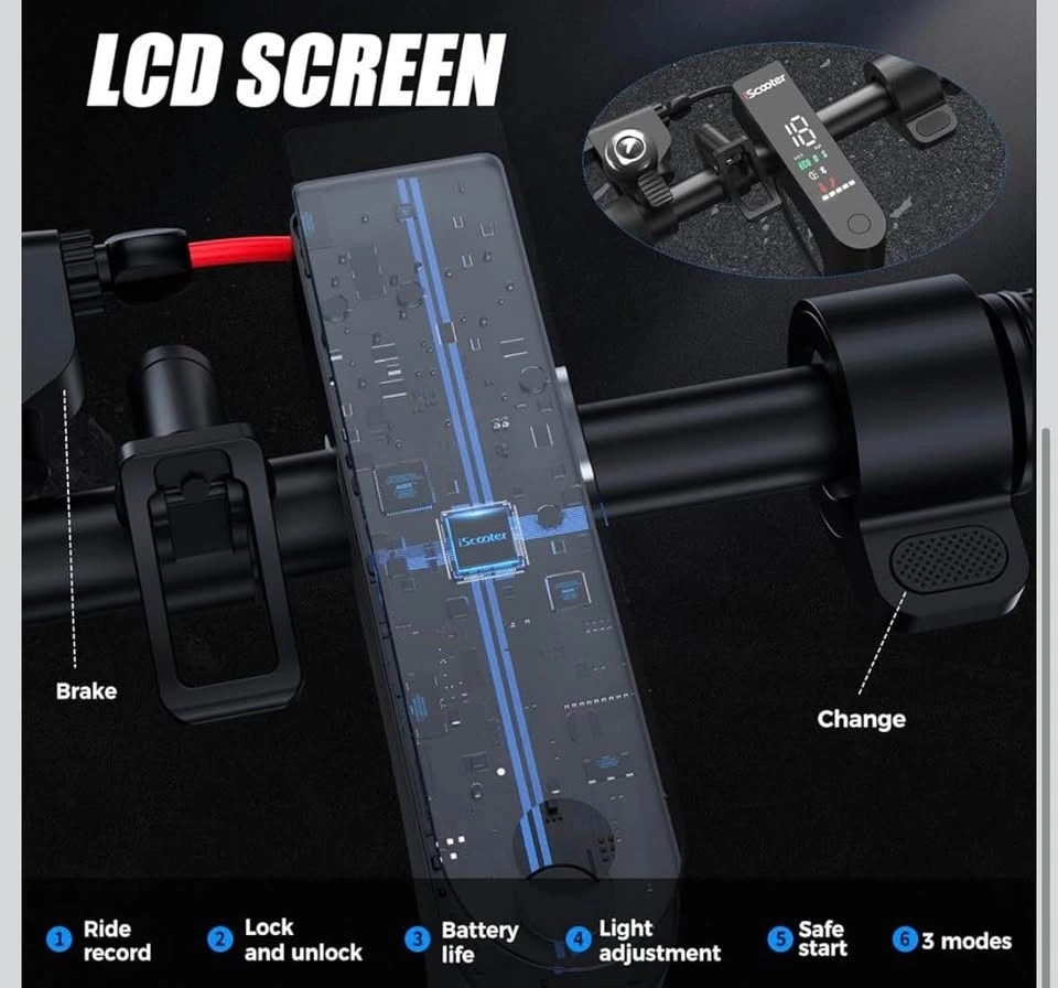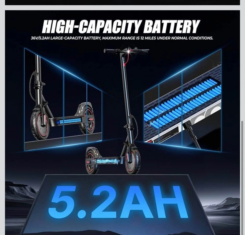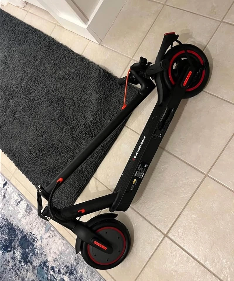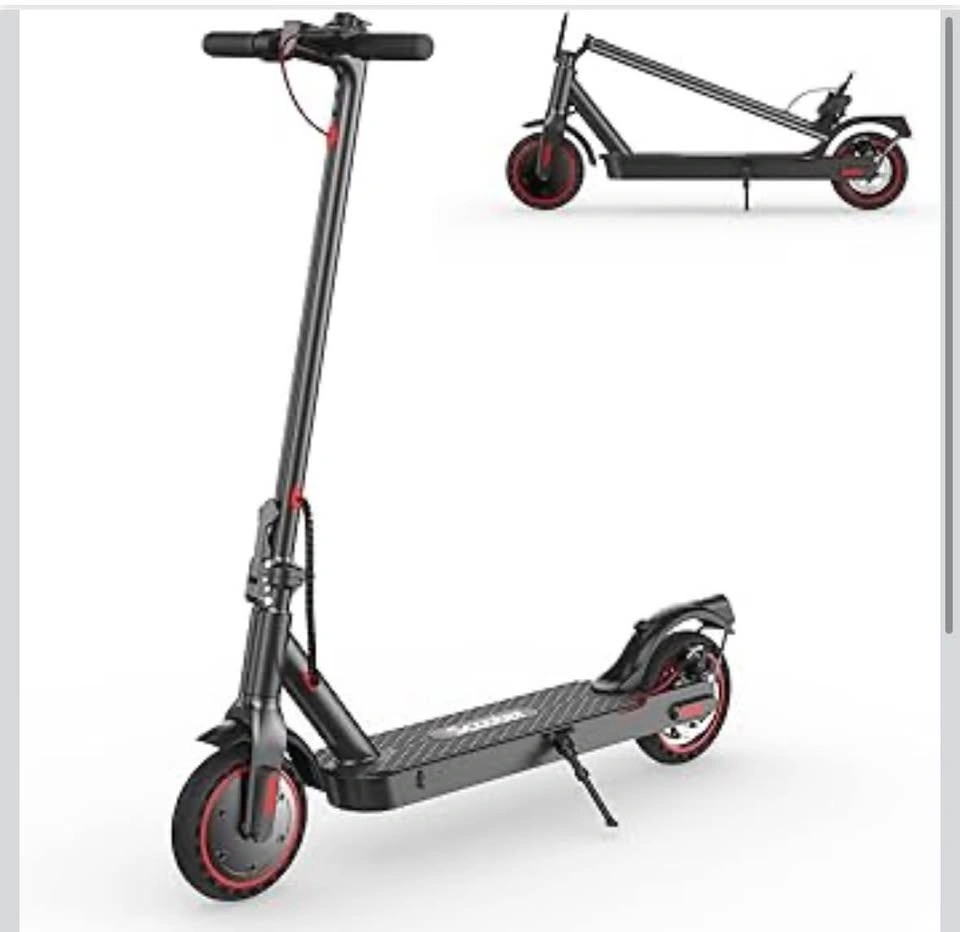 Brand new, still in the box. This is a 350W iScooter electric scooter in black with red accents on the wheels. It has a digital display on the handlebars and a bell. Super fun for cruising around.