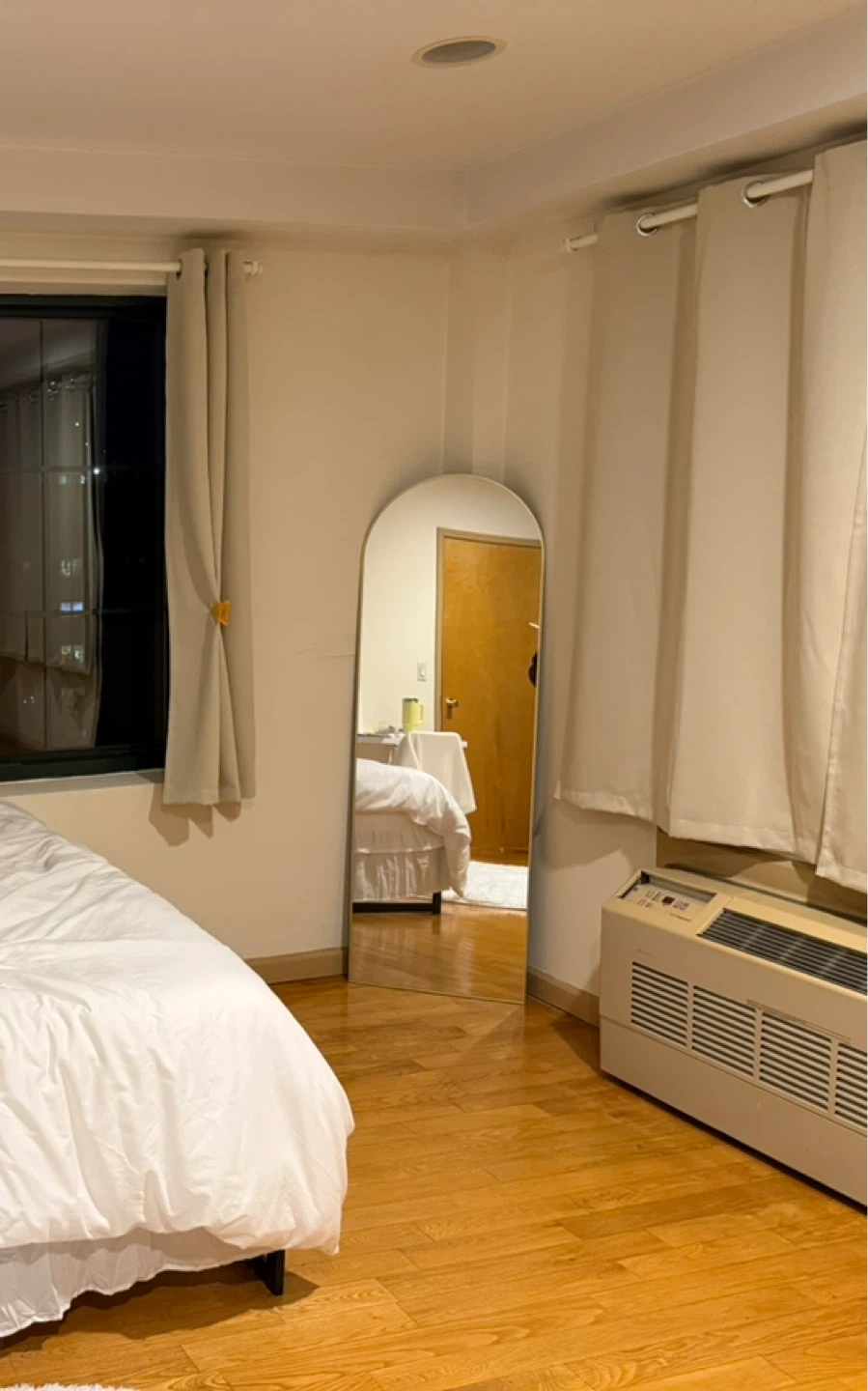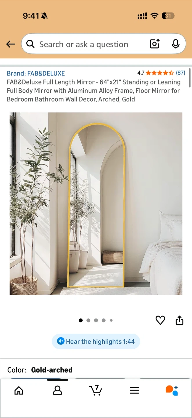 This is a FAB&DELUXE full length mirror. It's an arched mirror with an aluminum alloy frame. It can be stood or leaned, or hung on a wall. Dimensions are 64 inches tall by 21 inches wide.
