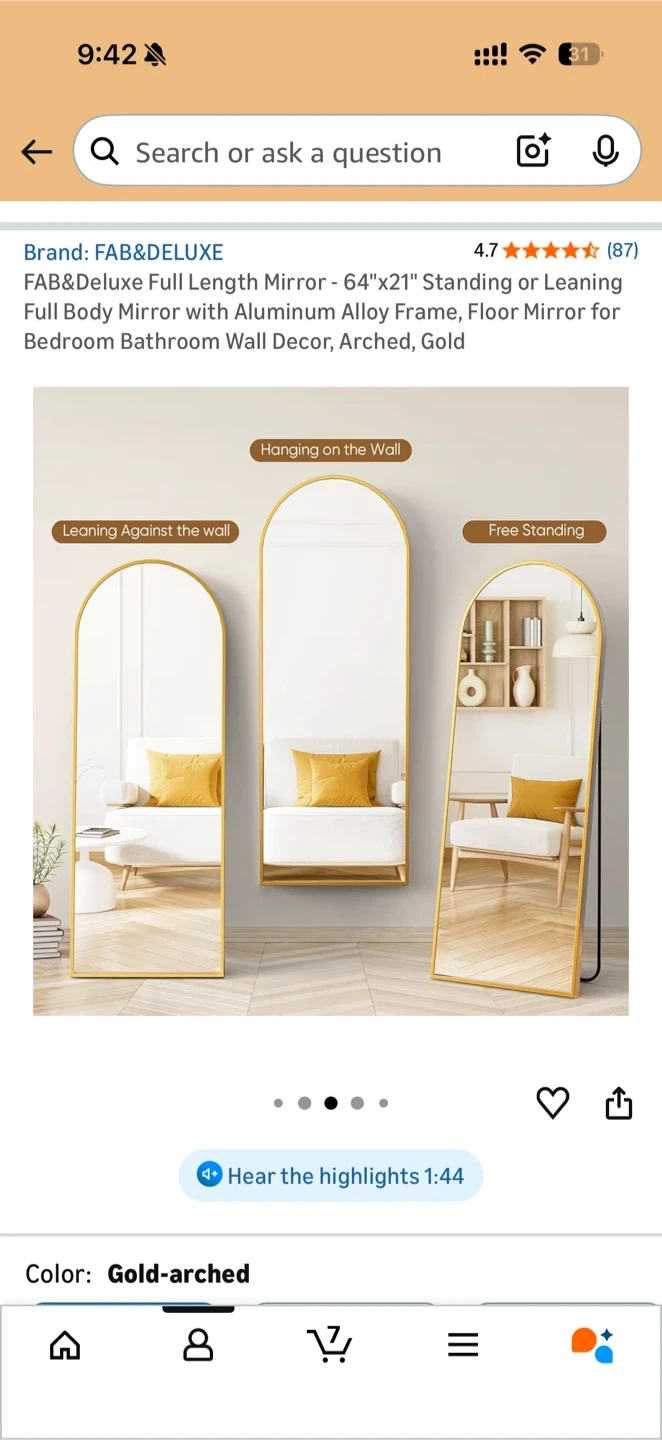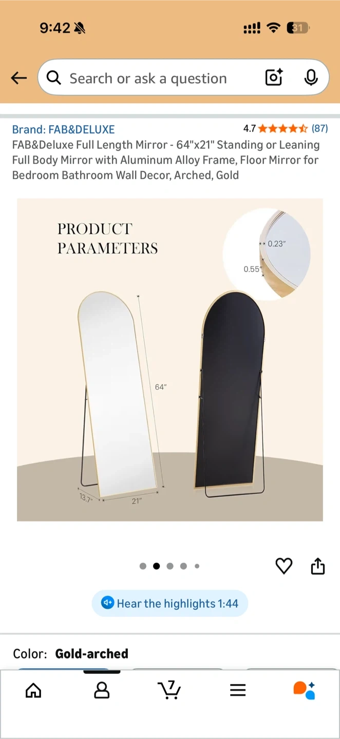 This is a FAB&DELUXE full length mirror. It's an arched mirror with an aluminum alloy frame. It can be stood or leaned, or hung on a wall. Dimensions are 64 inches tall by 21 inches wide.