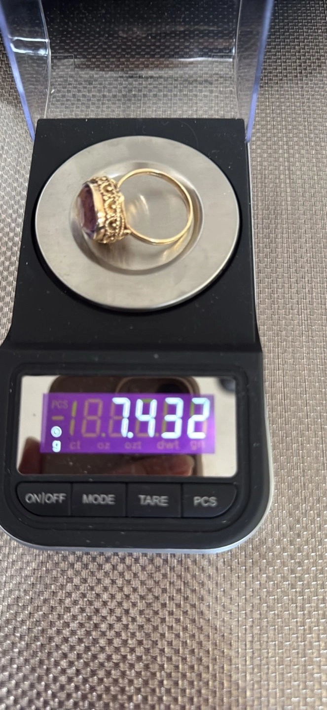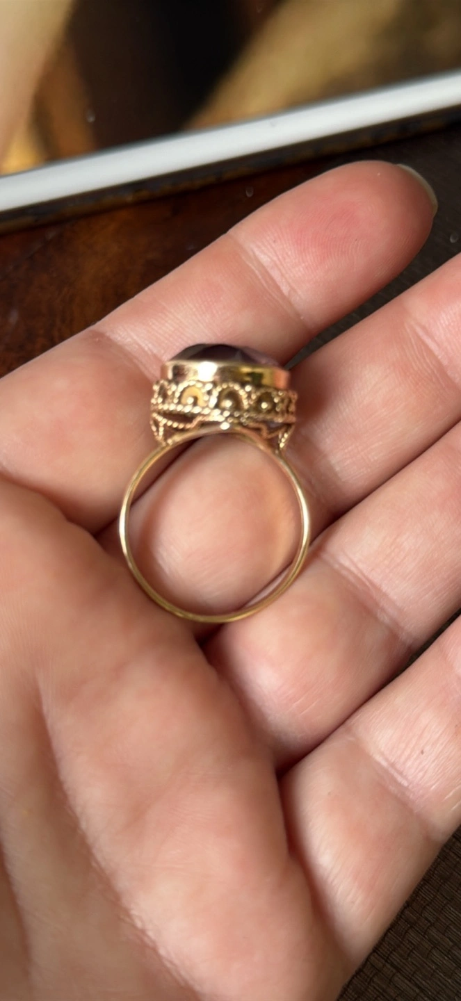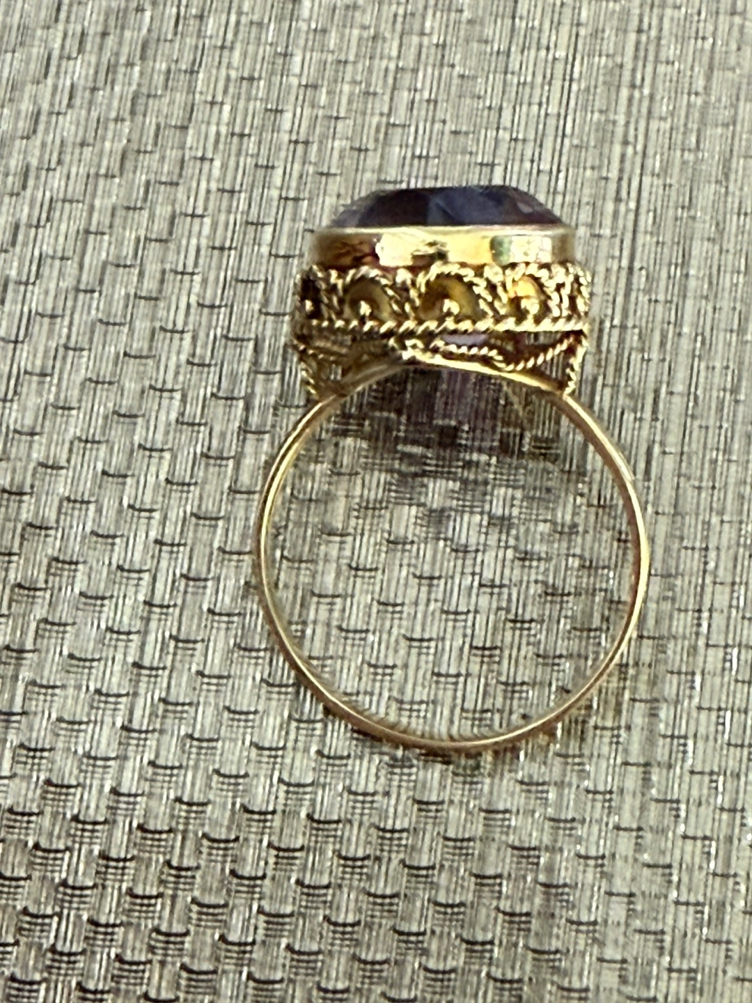 Beautiful antique ring. Features a large amethyst stone. Gold band. Intricate detailing.