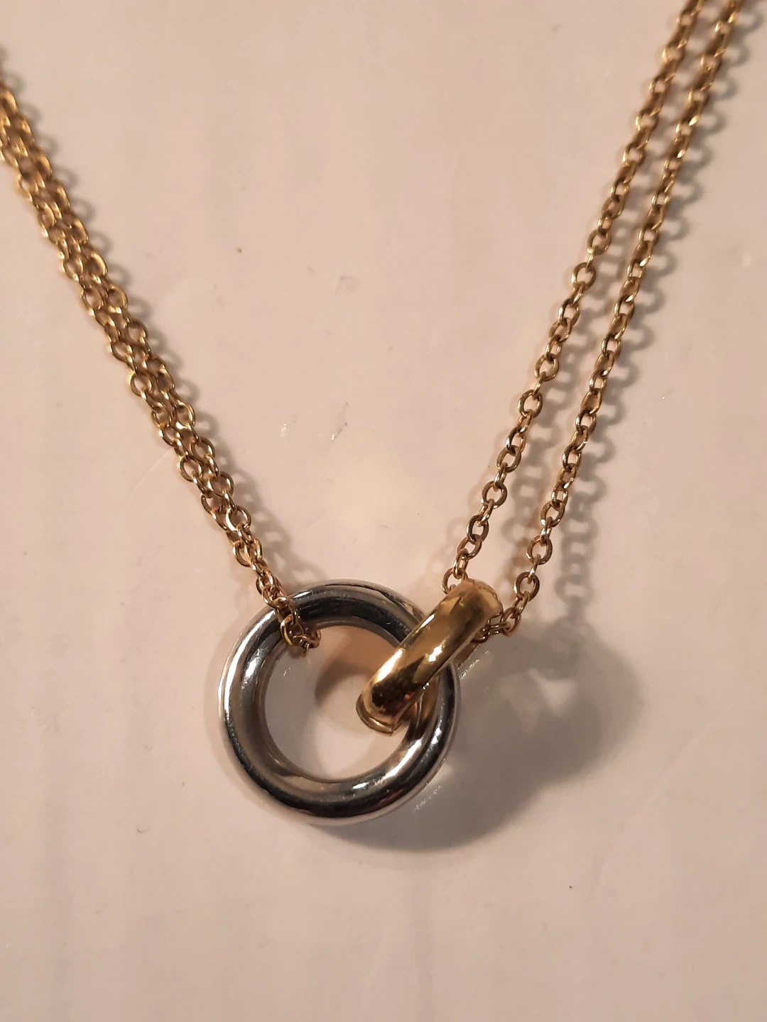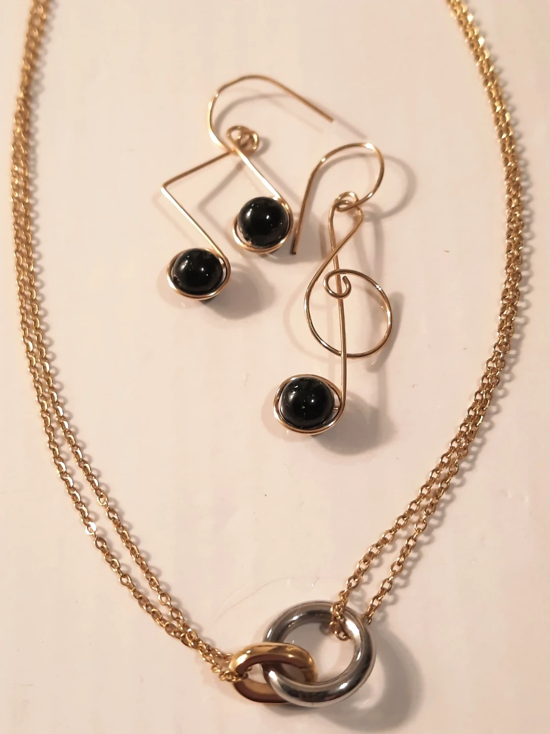 This set includes a gold-tone double-strand necklace stainless steel with interlocking rings and a pair of gold-tone gold filled.eill not tarnish.ling life.earrings shaped like music notes, each adorned with a black bead. The necklace chain measures approximately 20 inches.