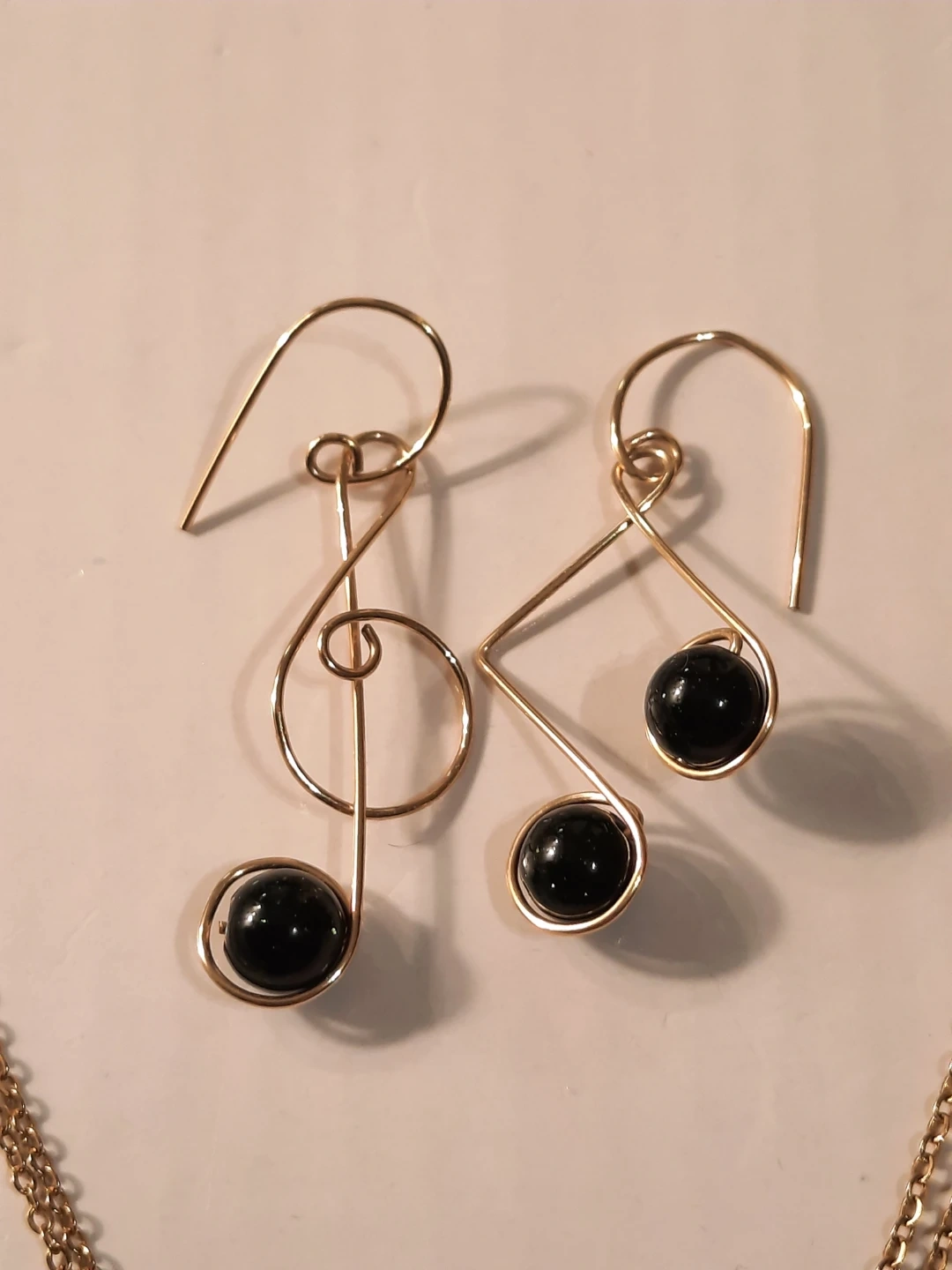 Gold-tone Necklace and Music Note Earrings Set with Black Beads