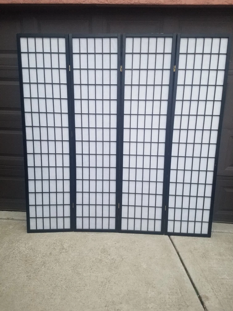 Four-panel room divider with a black wood frame and white Shoji paper. It's hinged to fold for storage or different configurations. Minor cosmetic wear is present.