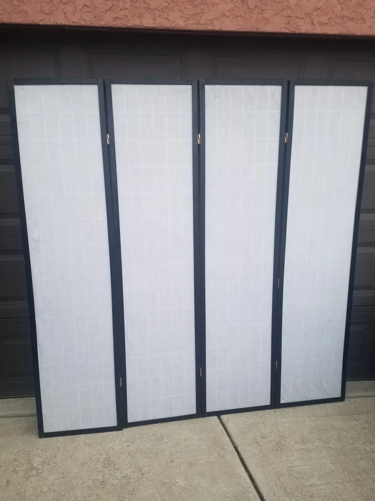 Four-panel room divider with a black wood frame and white Shoji paper. It's hinged to fold for storage or different configurations. Minor cosmetic wear is present.