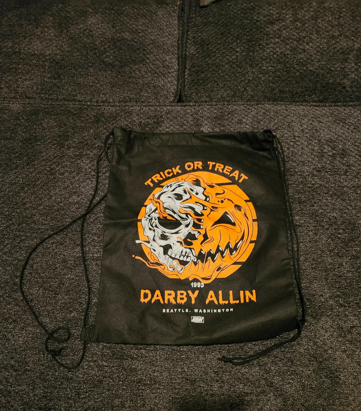 Black drawstring bag featuring Darby Allin and Halloween graphics. Includes "TRICK OR TREAT" text and "SEATTLE, WASHINGTON" location. Perfect for carrying your Halloween loot!