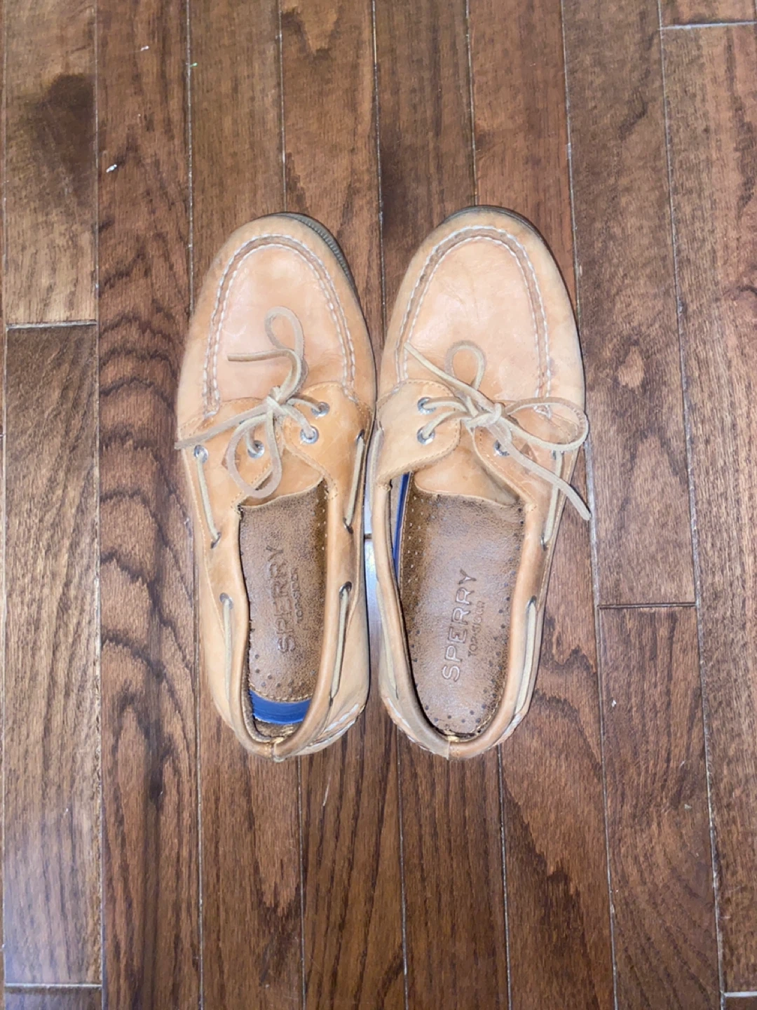 Classic tan leather boat shoes from Sperry. These shoes are built for comfort and durability. They're perfect for casual wear or heading out on the water!