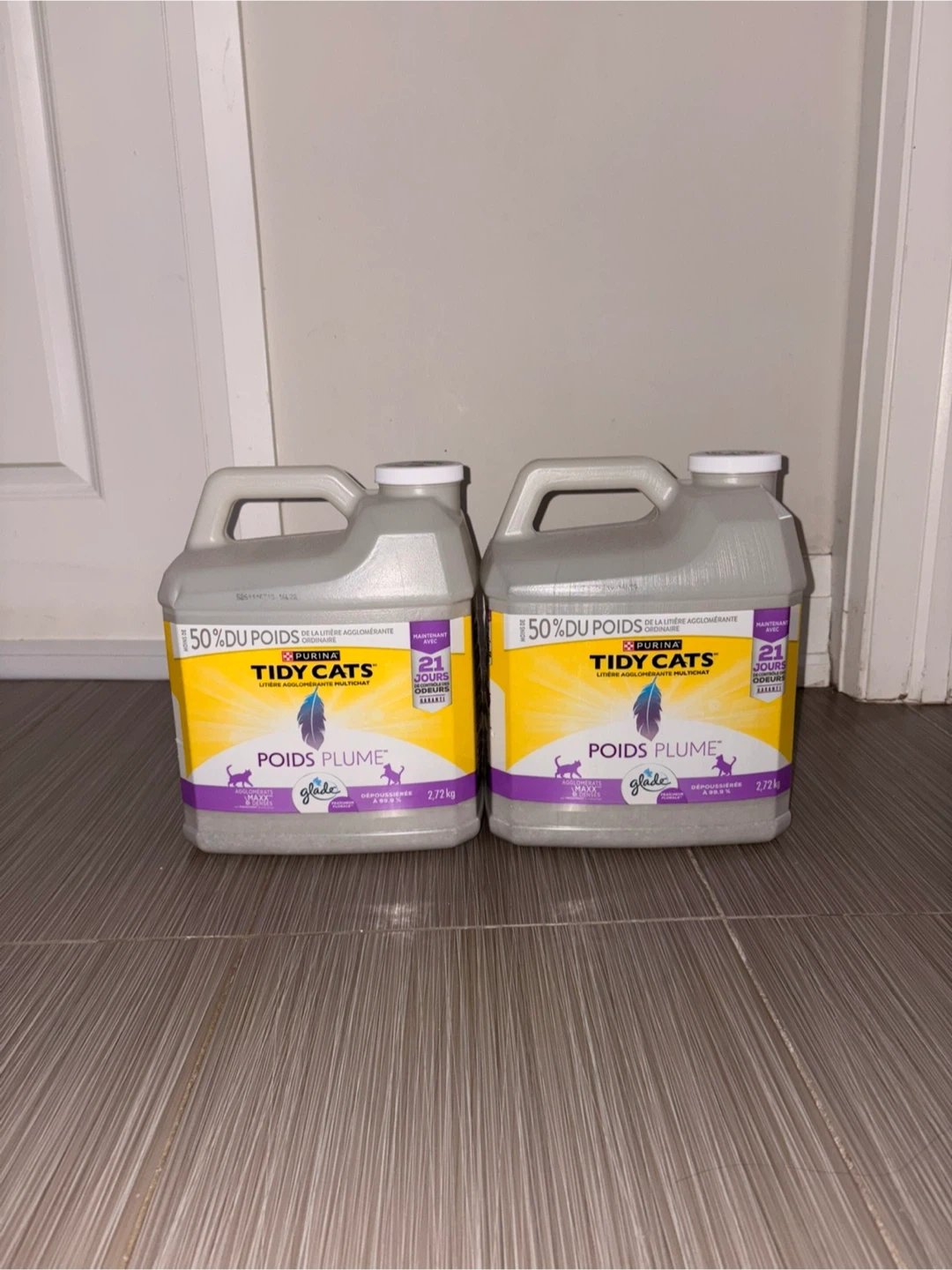 Selling two containers of Purina Tidy Cats clumping cat litter. Each container is 2.72 kg and features a lightweight formula. It's designed to control odours for up to 21 days.
