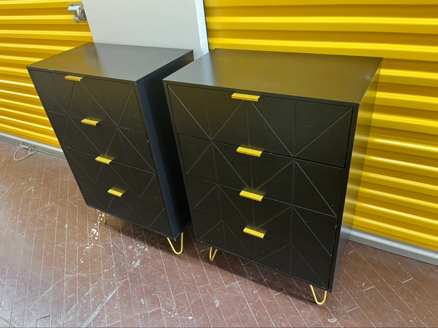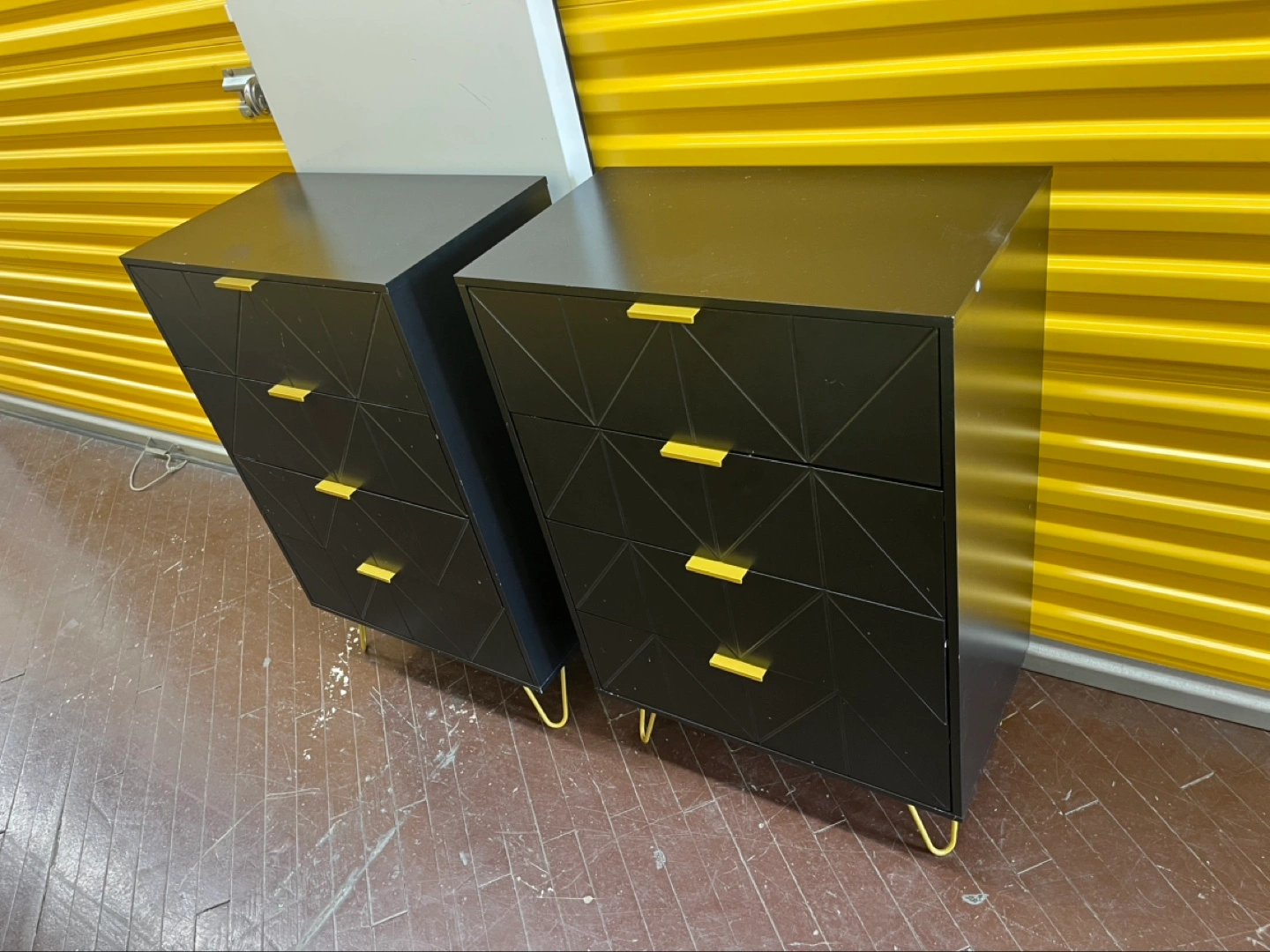 Set of two black chests of drawers. Four drawers per chest. Gold drawer pulls and hairpin legs. Geometric design on the front. $75 for each. Pick-up only.