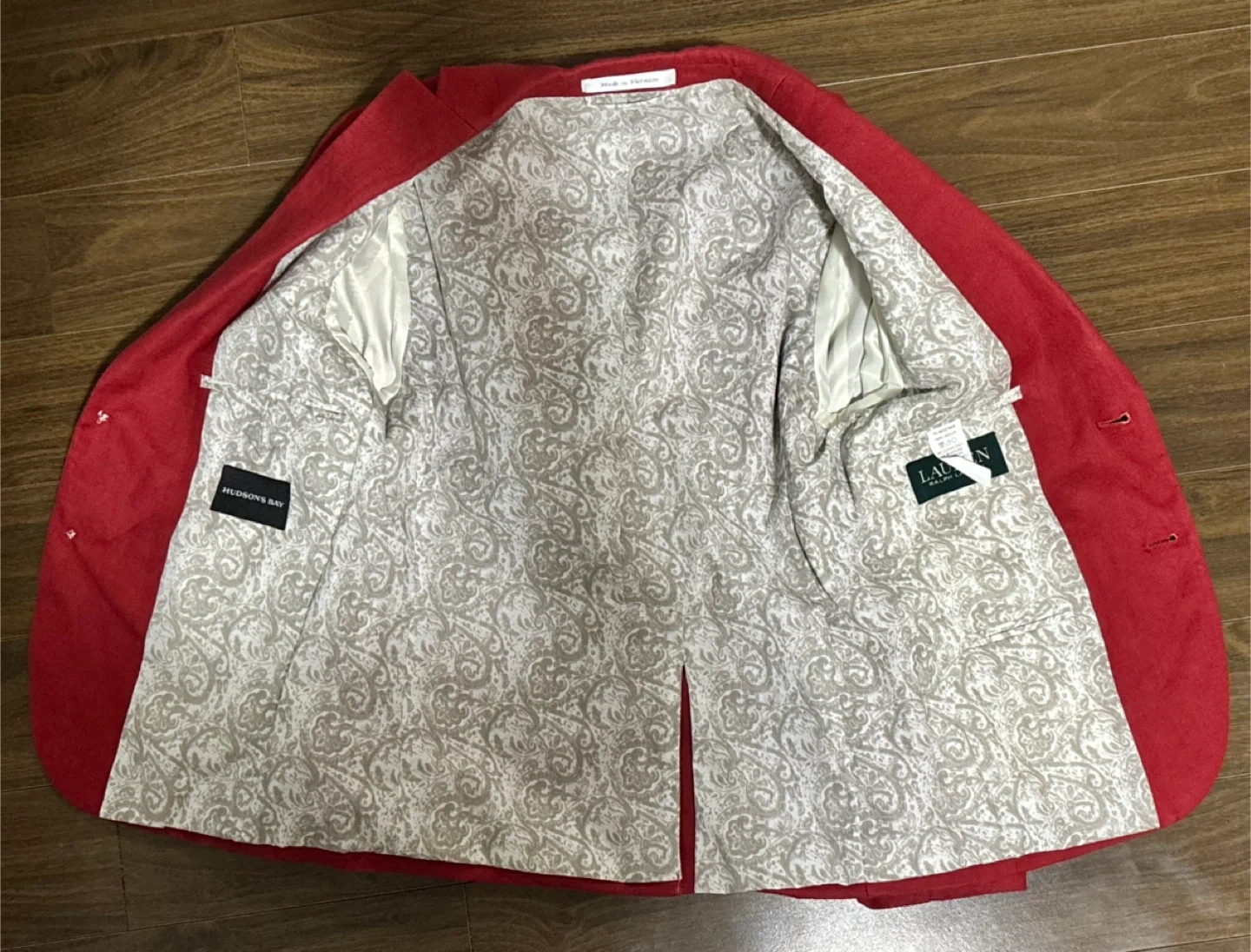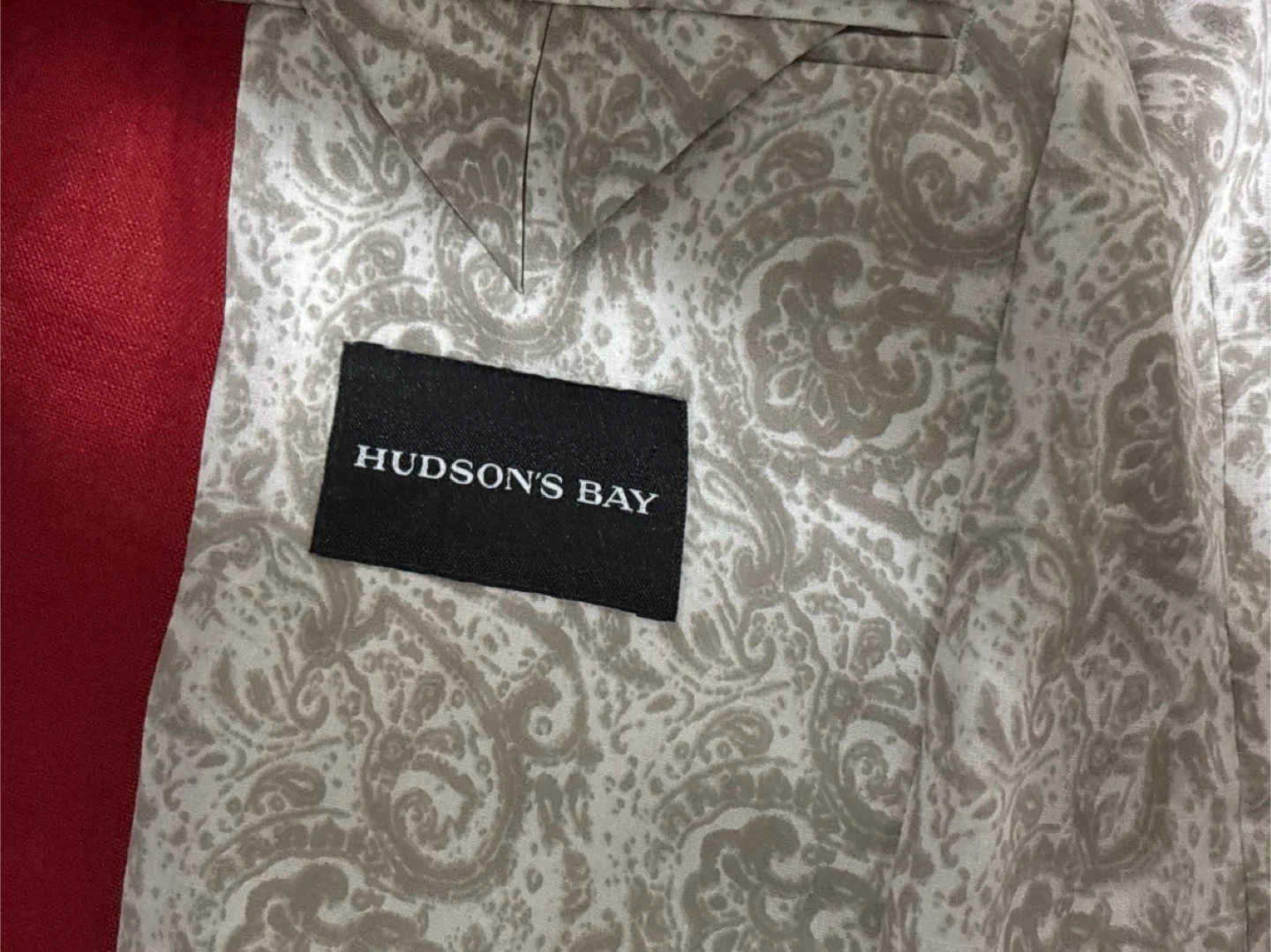 Ralph Lauren blazer in a vibrant red colour. Features a patterned lining and two front pockets. Includes a Hudson's Bay label inside.