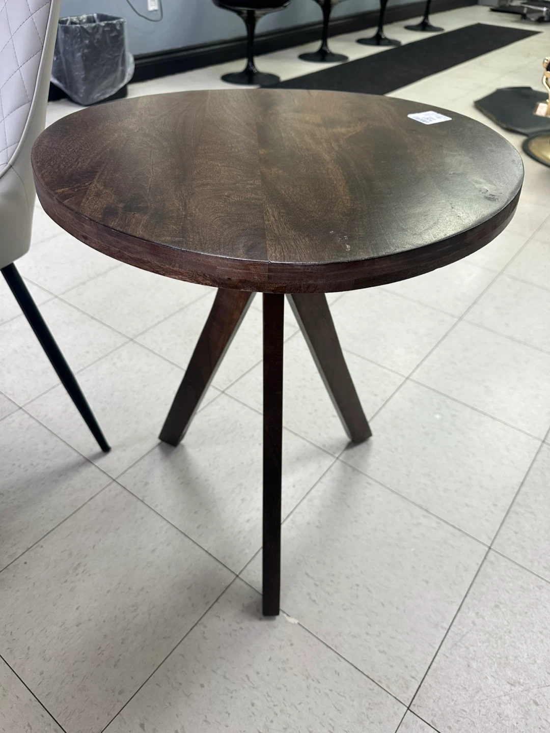 This round side table has a dark wood finish and a three-leg base. It's made from wood. It's a nice size for a lamp or decor.