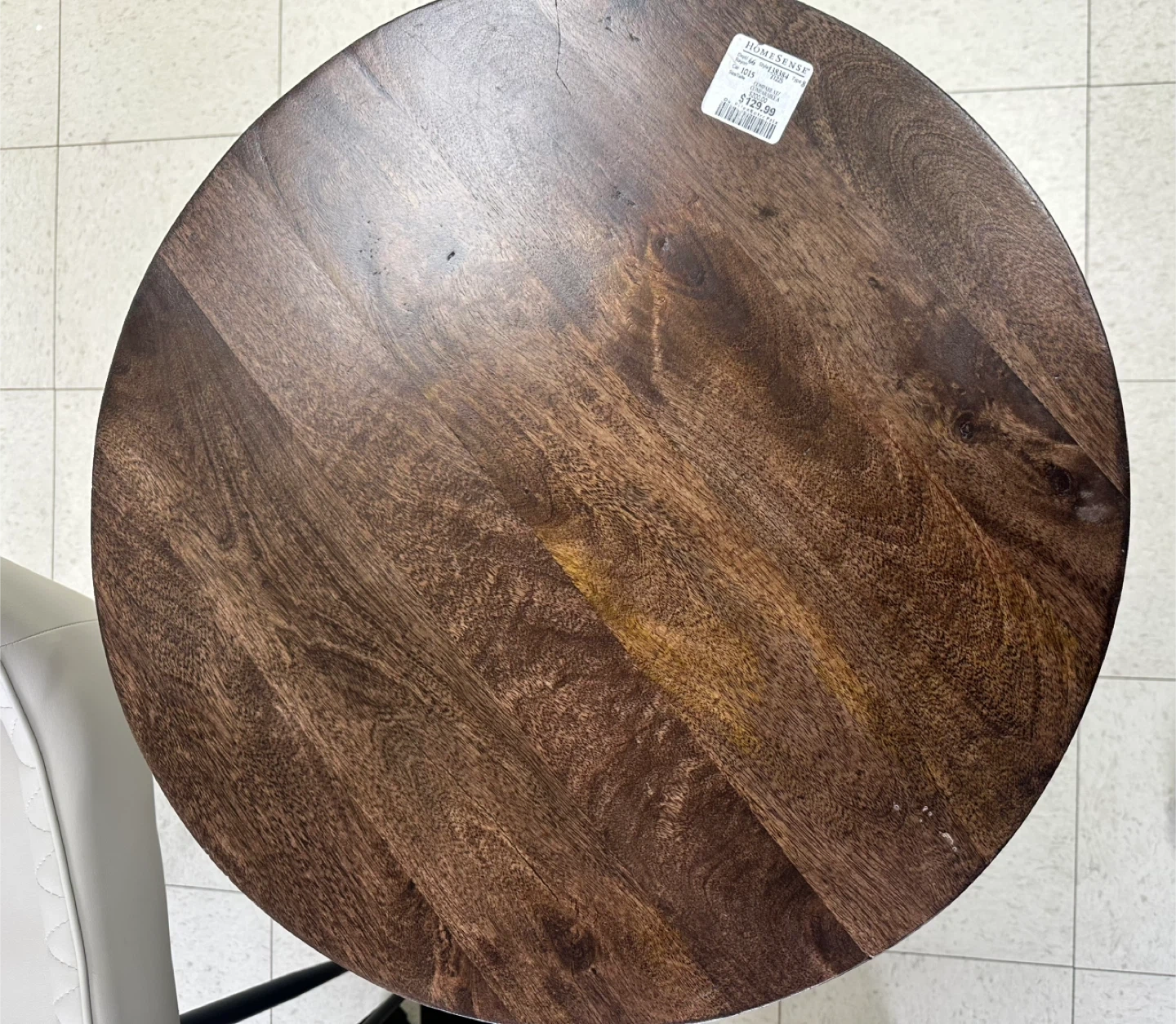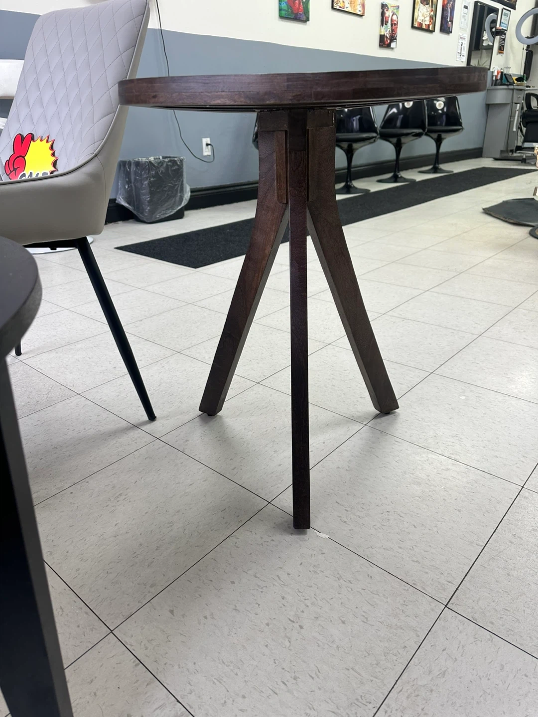 This round side table has a dark wood finish and a three-leg base. It's made from wood. It's a nice size for a lamp or decor.