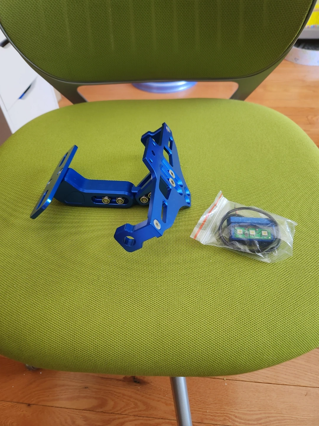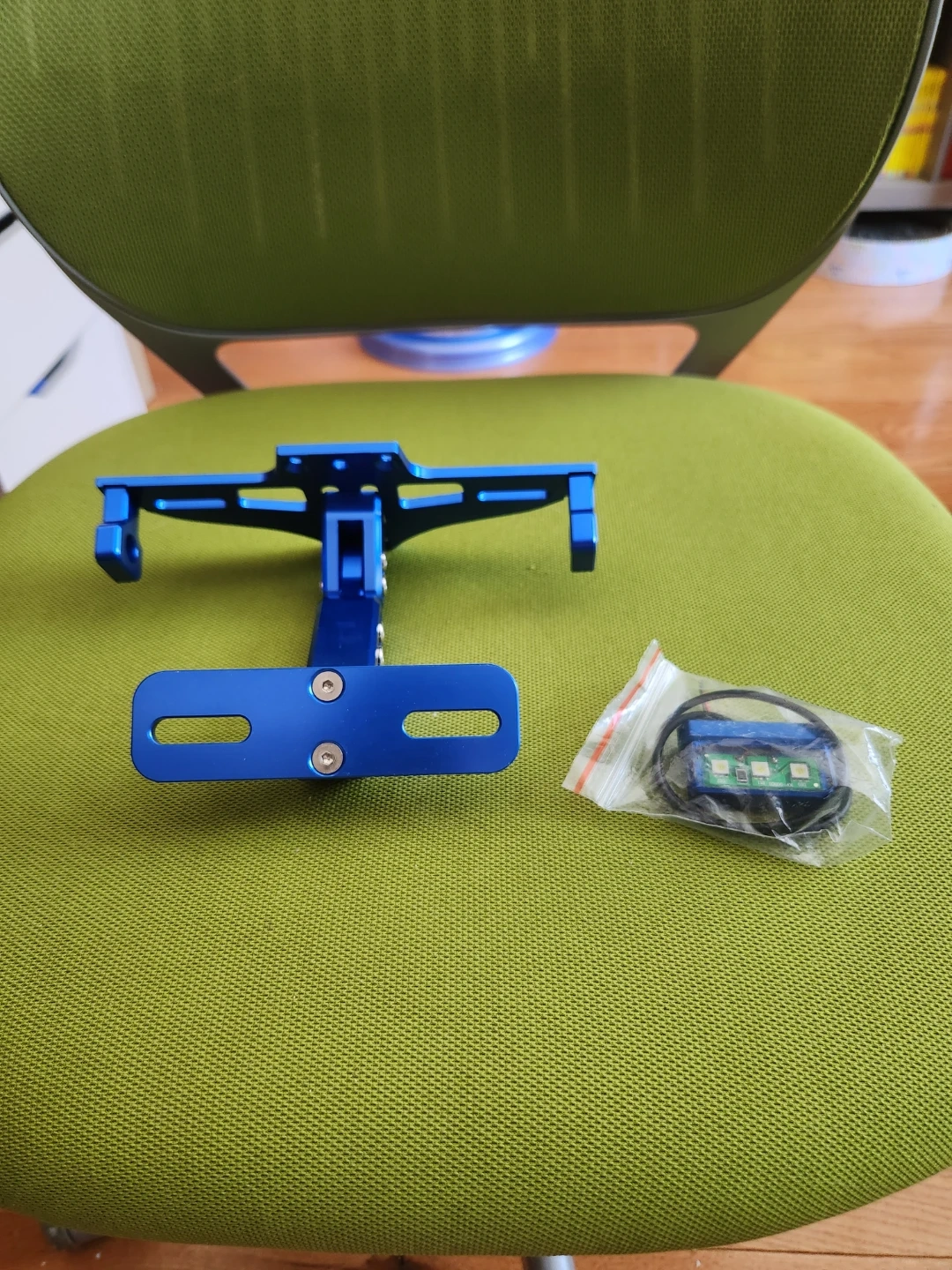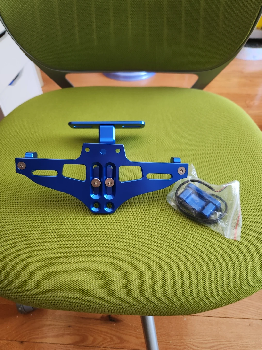 A blue fender eliminator license plate bracket I purchased when i owned my R3. It's made of metal and includes a small LED light. (Hardware and signals sold seperatly)