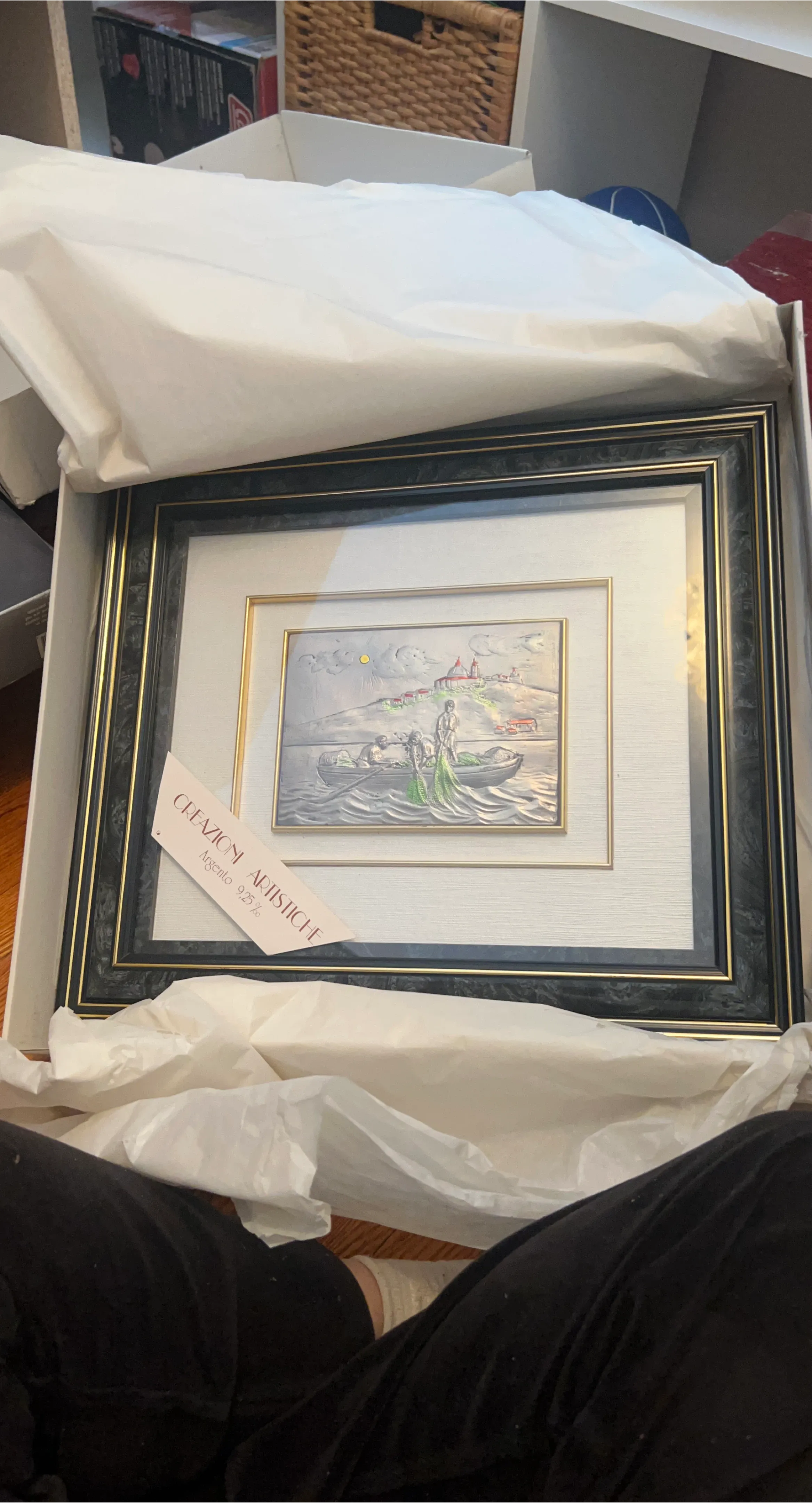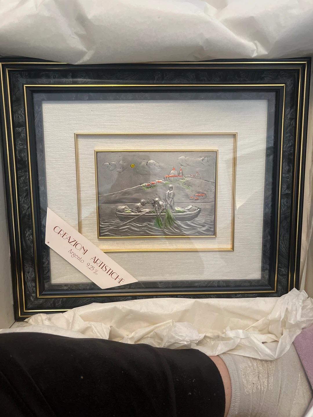 Framed artwork by Creazioni Artistiche, made with 92.5% silver. It depicts a scene with people in a boat near a village. Includes original packaging. Brand New in a box