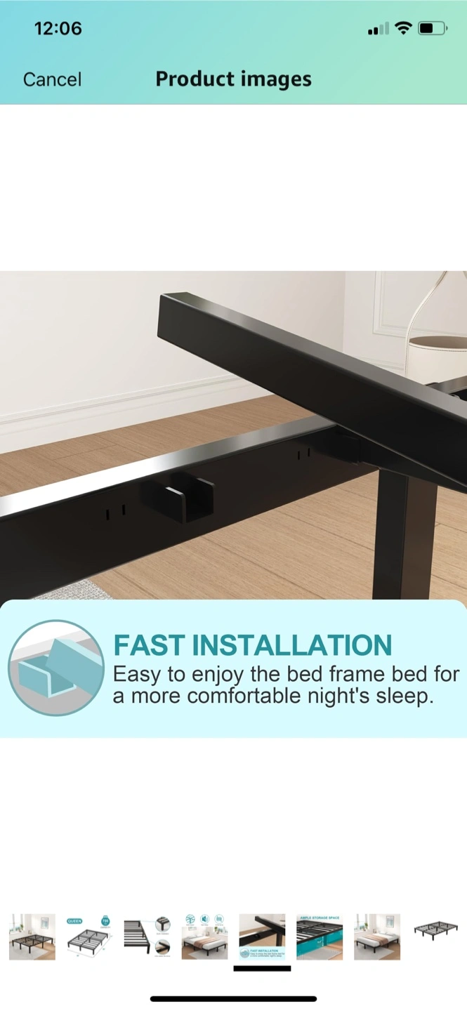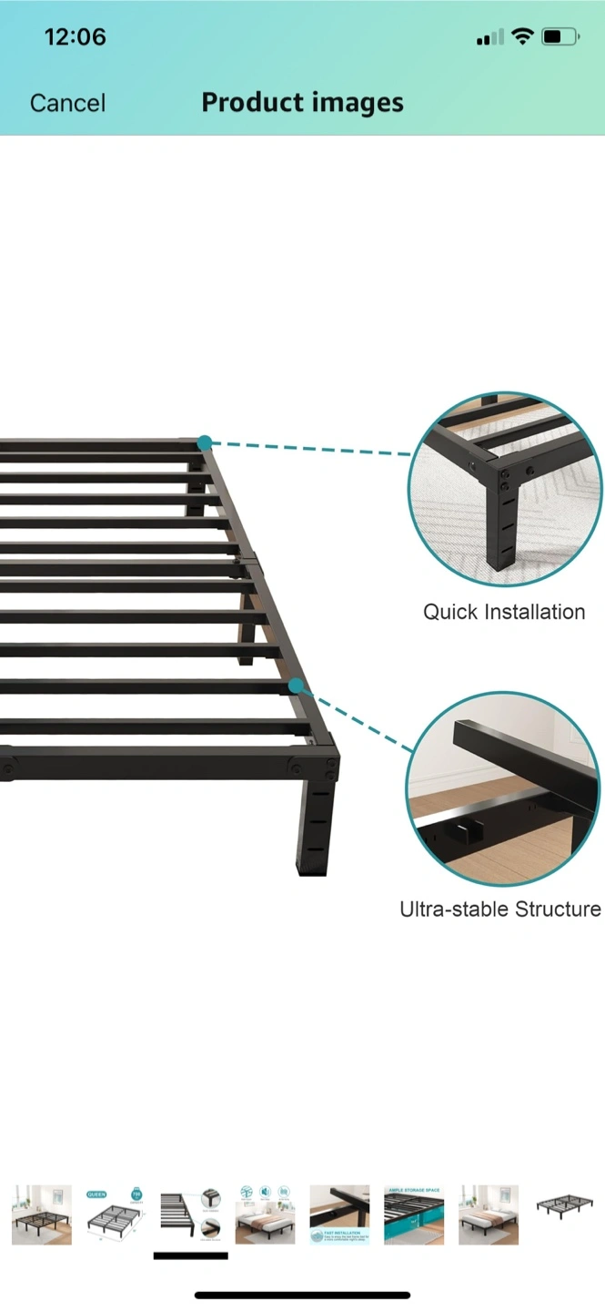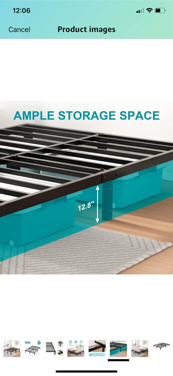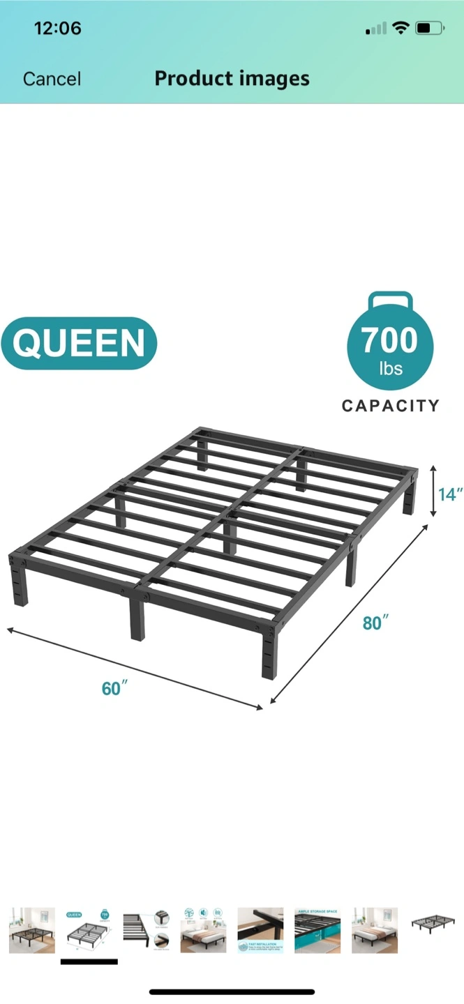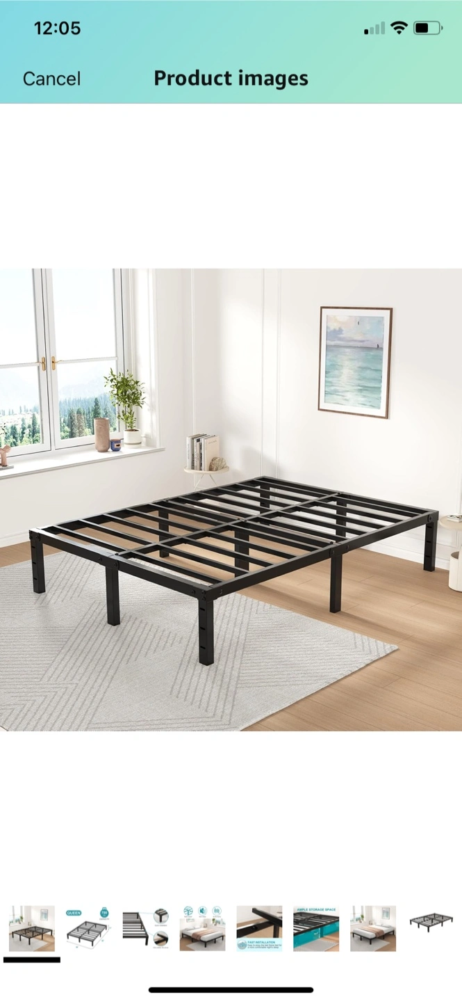A black, metal bed frame. Designed for a queen size mattress. Great for those who need additional storage space. Place this in your room for a peaceful sleep every night. I could have it partially disassembled to easier pick up.