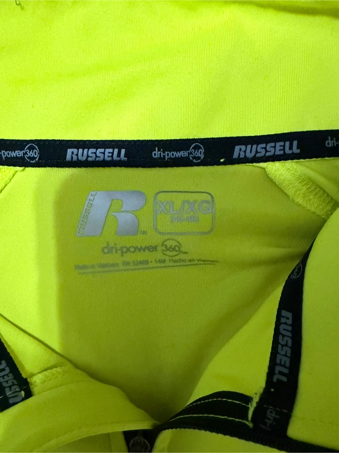 This is a Russell Athletic long-sleeve quarter zip pullover shirt. It's a bright neon yellow color and has a "dri-power 360" moisture-wicking fabric. The size is XL.