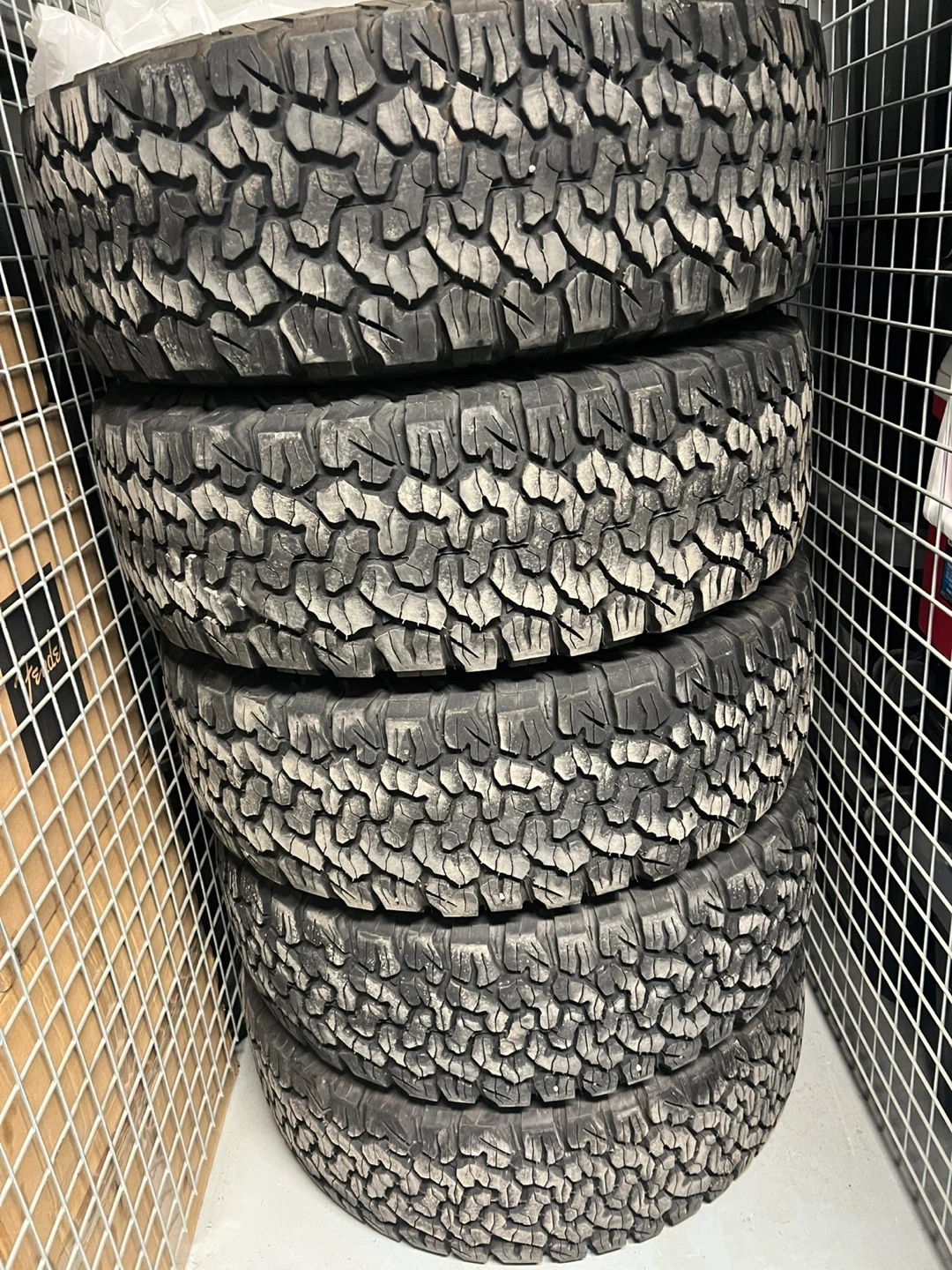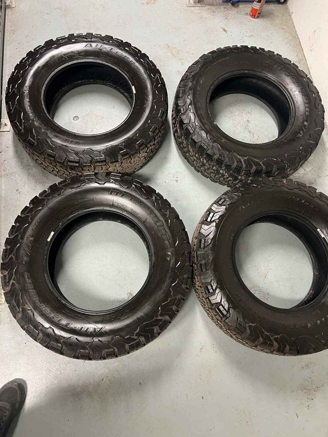 Set of four BFGoodrich All-Terrain T/A KO2 tires. Load range C, size LT255/75R17. M+S rated for mud and snow traction. Tread depth measured at 11/32nds to 14/32nds.