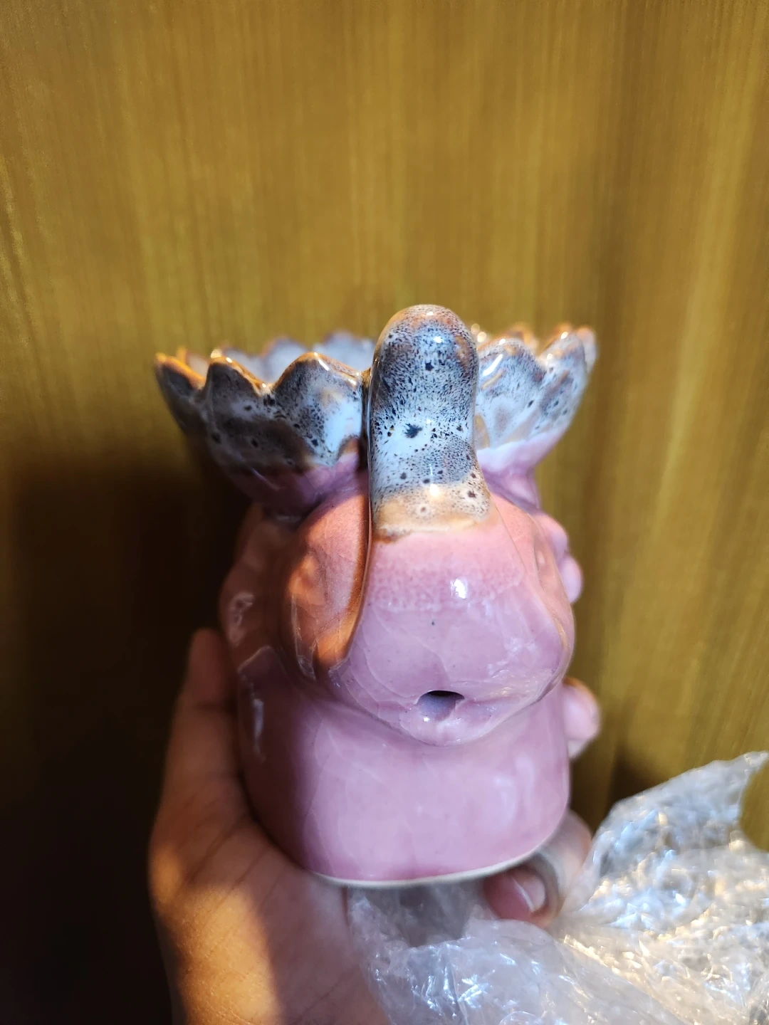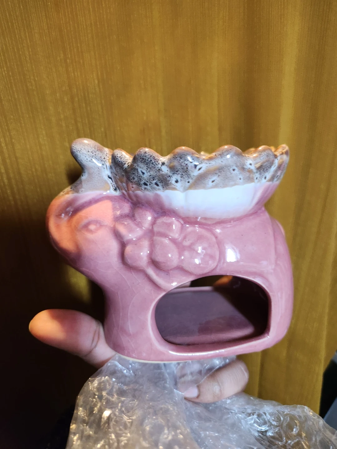 This cute pink ceramic elephant oil burner is shaped like an elephant with a floral dish on top. It's perfect for diffusing essential oils or for use as a wax melt warmer. The dish has a textured surface with many small indentations. It's a fun piece for home decor!