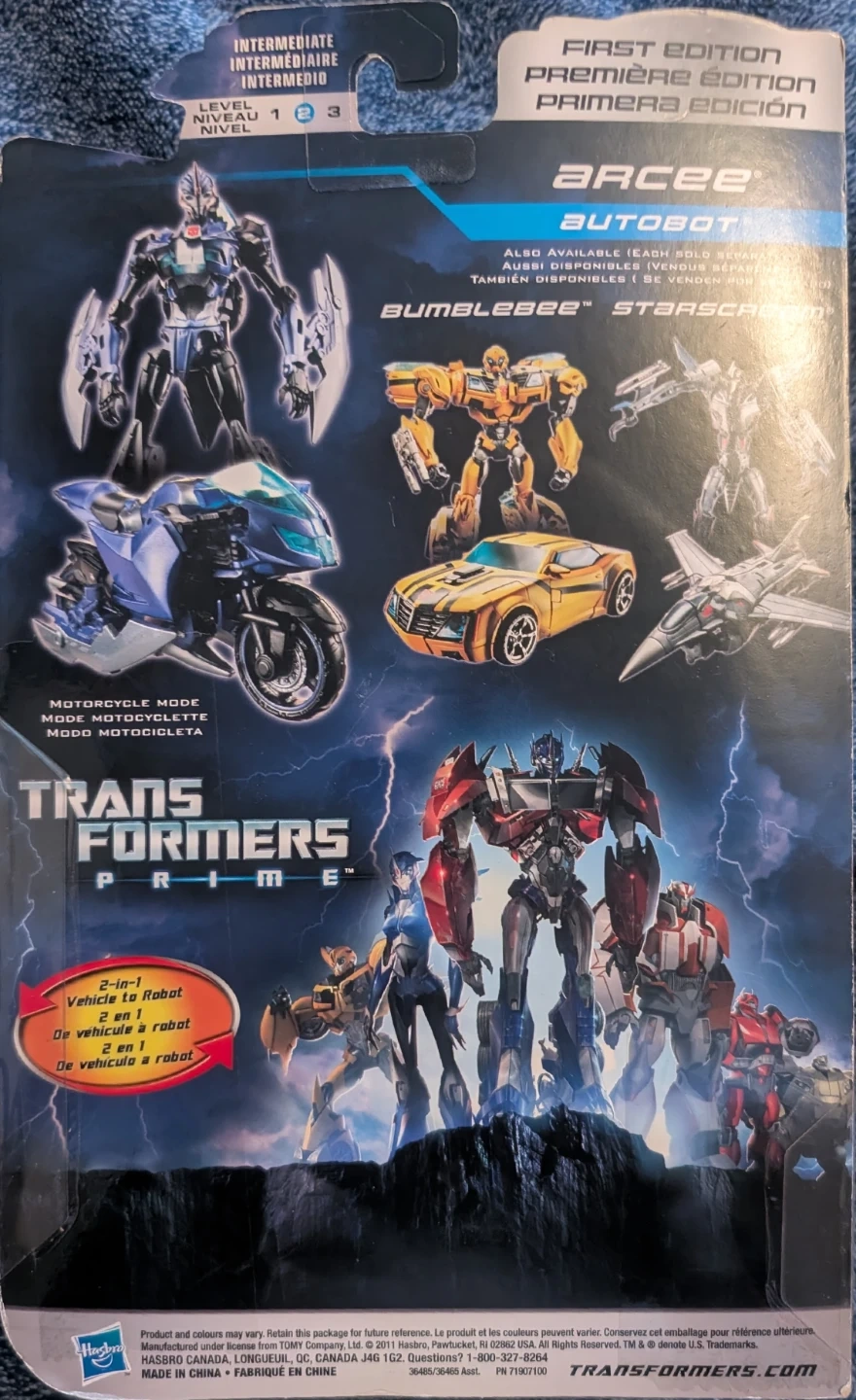 This deluxe size Transformers Prime, first edition, Arcee action figure transforms from a sports motorcycle to robot, and back again.