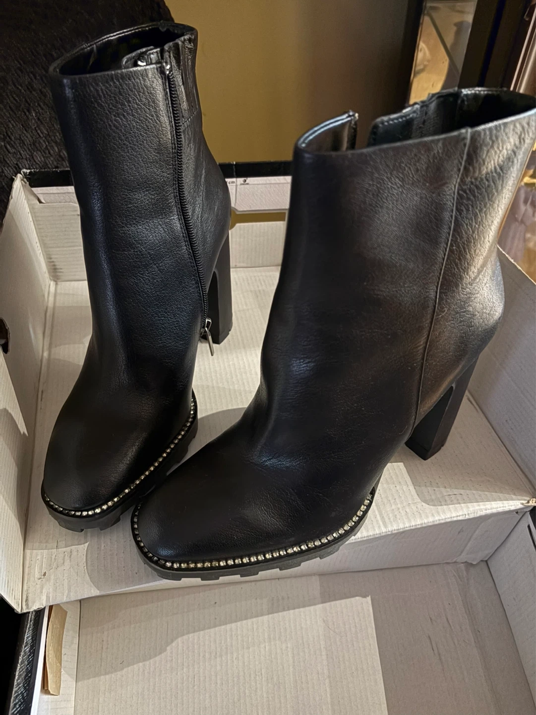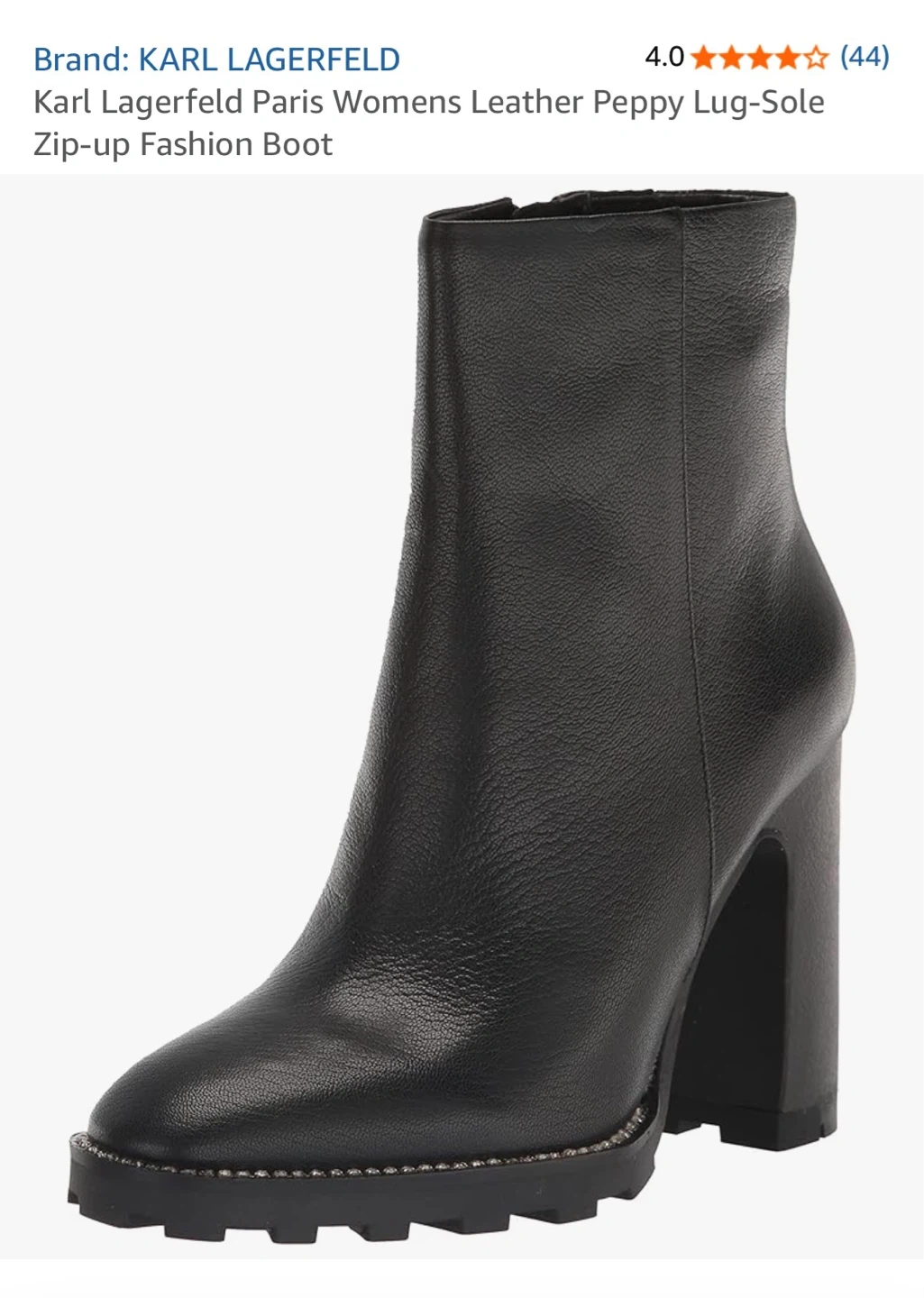 These Karl Lagerfeld Paris boots are made from black leather. They feature a lug-sole and a side zipper closure. Comes with the original box.