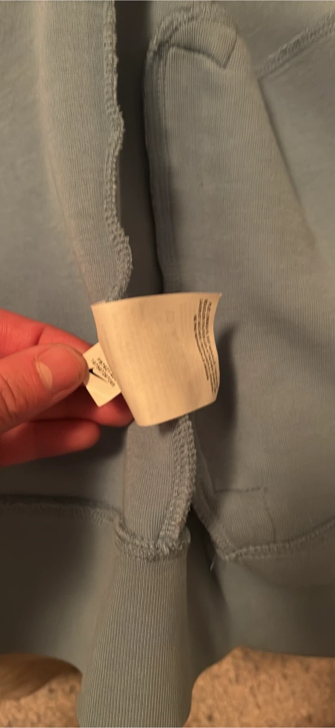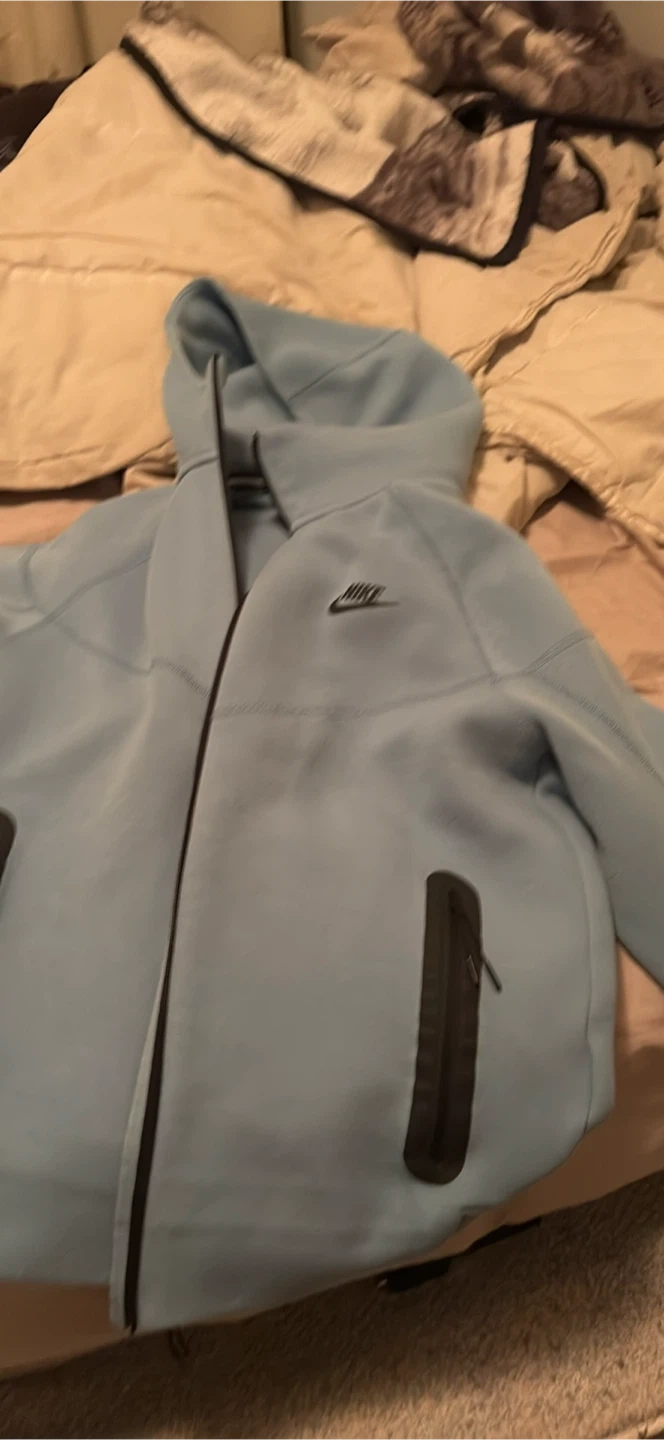 Light blue Nike Tech Fleece full-zip hoodie. Features zippered pockets and a comfortable hood. Made for warmth and style.