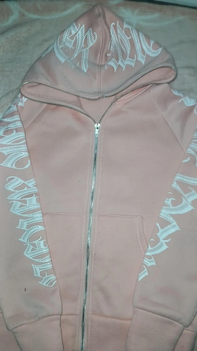 This zip-up hoodie is a soft pink with a bold white graphic design on the hood and sleeves. It features a full-zip front and a comfortable hood. It's made from a soft fabric blend, perfect for casual wear.