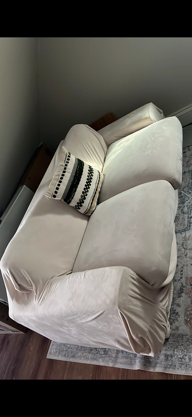 Protect your sofa with this light beige couch cover. It's made of a soft, stretchy fabric that fits most standard couches. Includes one decorative throw pillow with a geometric pattern. Easy to put on and take off for cleaning!