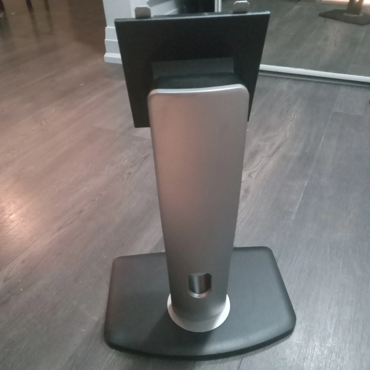 Dell monitor stand with a black and silver finish. It's designed to hold a monitor and includes a sturdy base with a movable arm. This stand is perfect for setting up a desktop workstation.