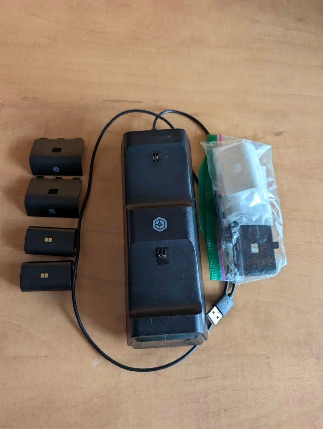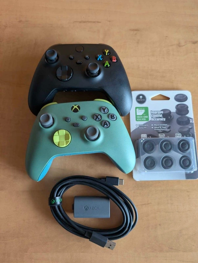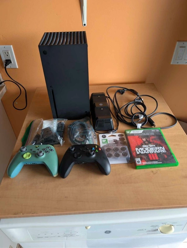 Selling a Xbox Series X with 1TB SSD in good condition, includes original cables. Comes with 2 controllers (one with original rechargeable battery + cable), a charging dock, 2 rechargeable batteries, extra backplates, thumb grips, and Call of Duty: Modern Warfare III.