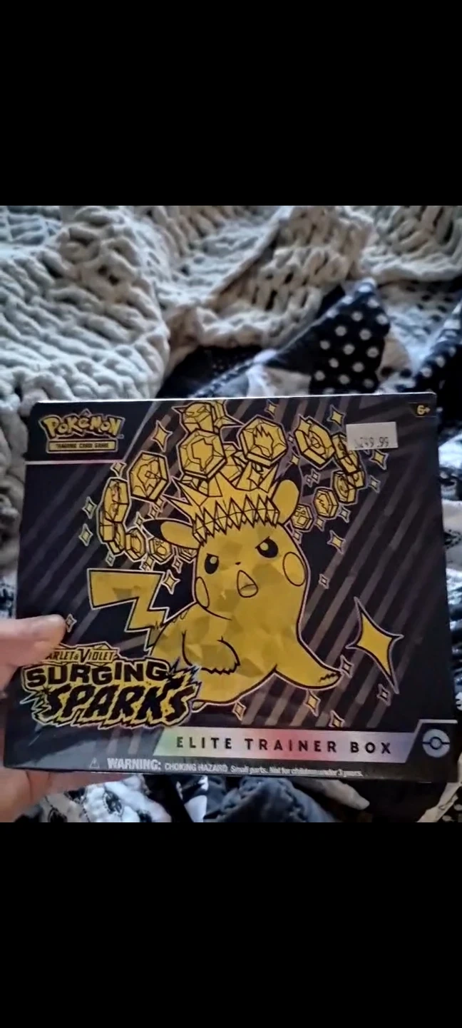 This Pokémon TCG: Scarlet & Violet—Surging Sparks Elite Trainer Box includes 9 booster packs, 1 full-art foil promo card featuring Magneton, 65 card sleeves, 45 Energy cards, a player's guide, 6 damage-counter dice, 1 coin-flip die, 2 condition markers, and a collector's box with 4 dividers. It also comes with a code card for the Pokémon Trading Card Game Live. Let me know if you're interested!