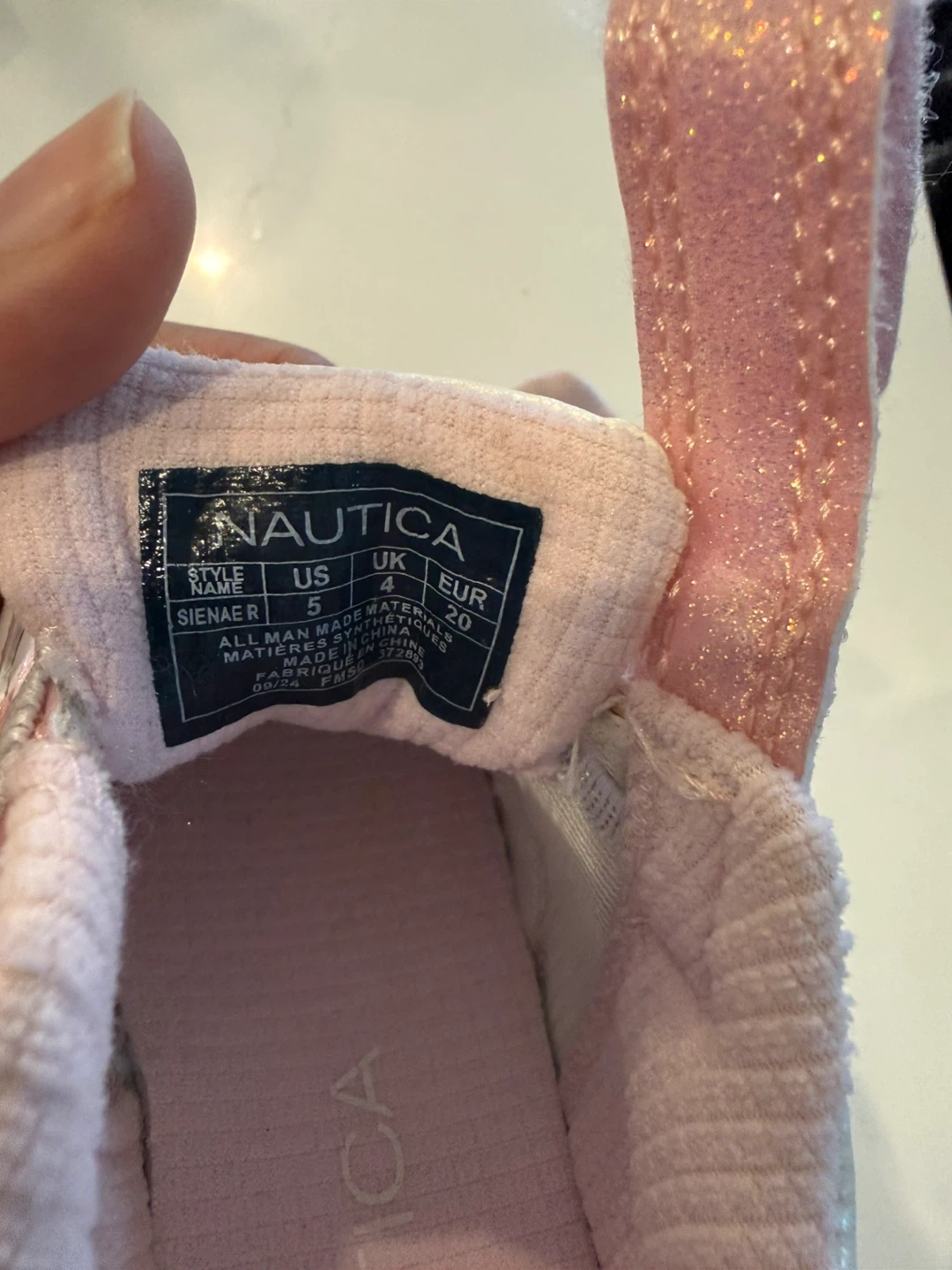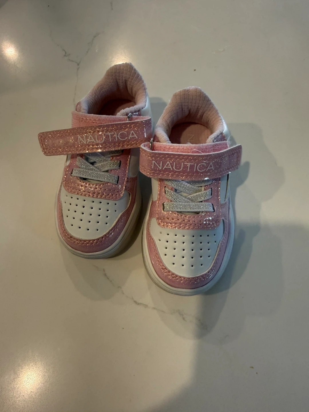 These pink and white Nautica sneakers are a size US 5. They feature Velcro straps for easy on and off. Perfect for little ones on the go! My baby sadly outgrew - pretty much brand new! Barely worn once- NO pets and NO smoking household! OBO! I got it for $35 with tax.