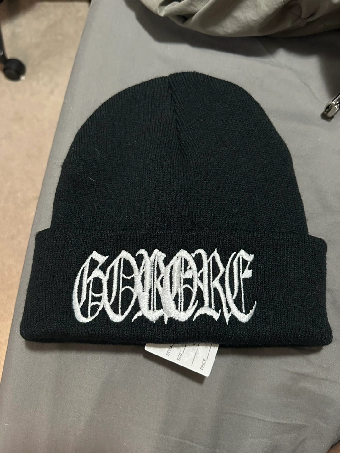Black knit beanies. Features white embroidered text reading "GOREcore" on side and other side features a white embroidered inverted cross. New with tags.