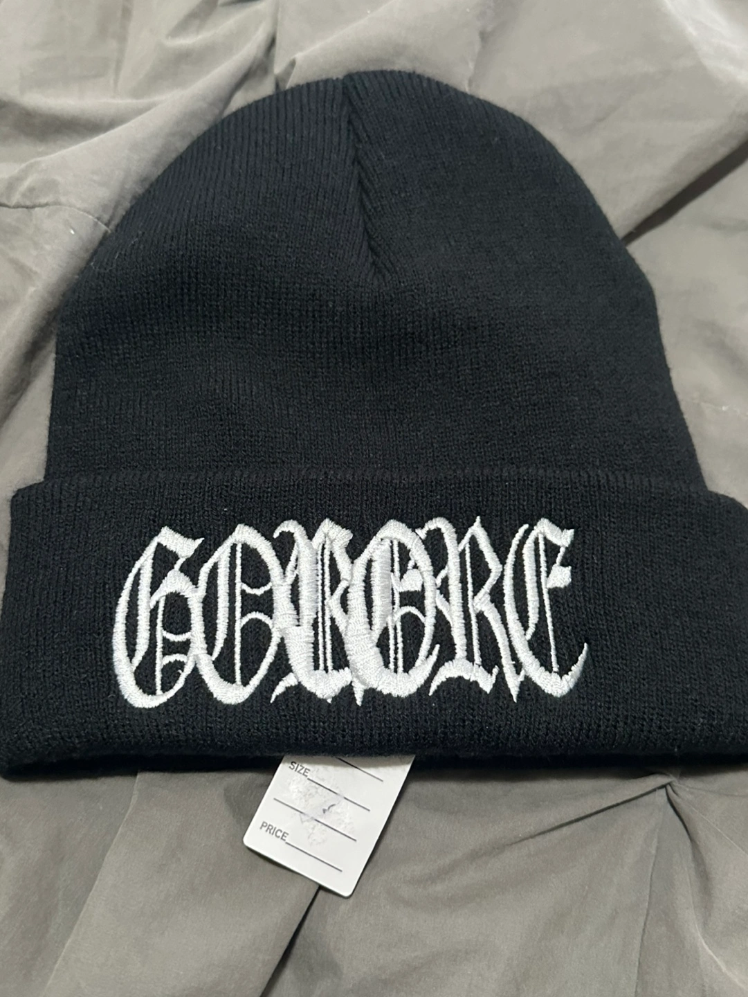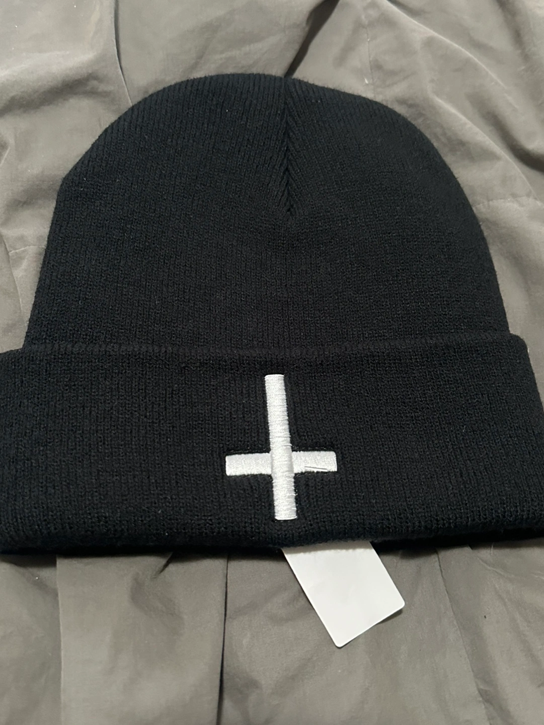 Black knit beanies. Features white embroidered text reading "GOREcore" on side and other side features a white embroidered inverted cross. New with tags.