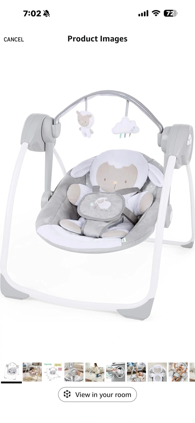 Ingenuity Cuddle Lamb baby swing. Features a weight range of 6-20 lbs and a max age of 9 months. Dimensions are 26.77 inches high, 22.64 inches wide, and 28.74 inches deep. It's designed for babies up to 9 months old.